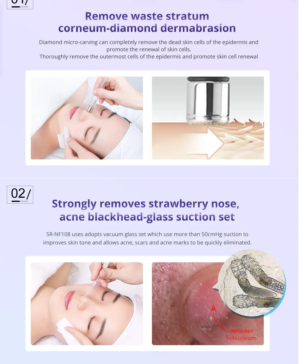 Cleans dirty pores through suctioning tubes and increases blood circulation in the skin.Helps give elasticity in the skin and can decrease discoloration from acne and scars.Cleaner and more effective, making the skin cleaner.