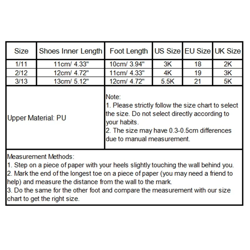Size 3/13: Shoes Inner Length 13cm(5.12"), Suitable For US Size: 5.5K, EU Size: 21, UK Size: 5K