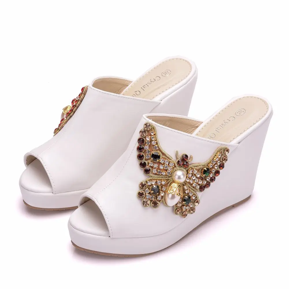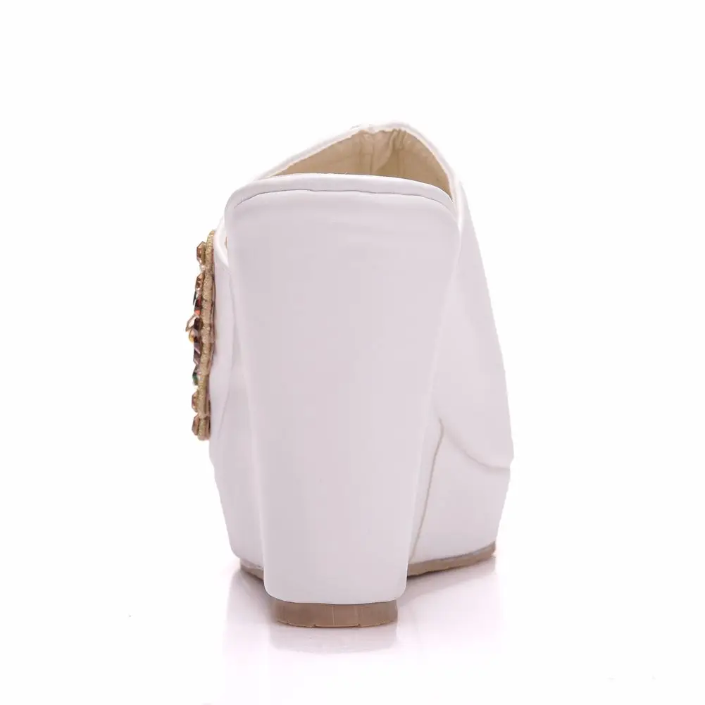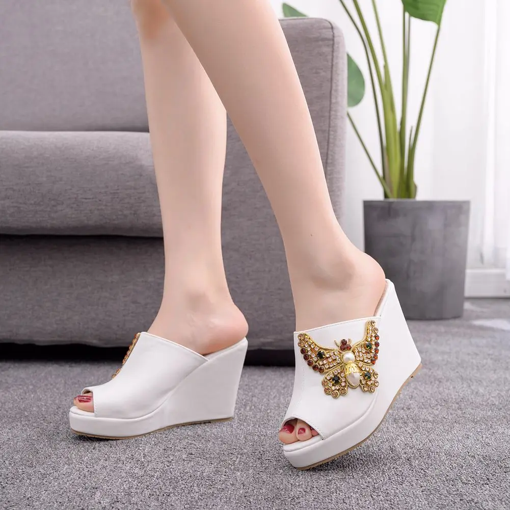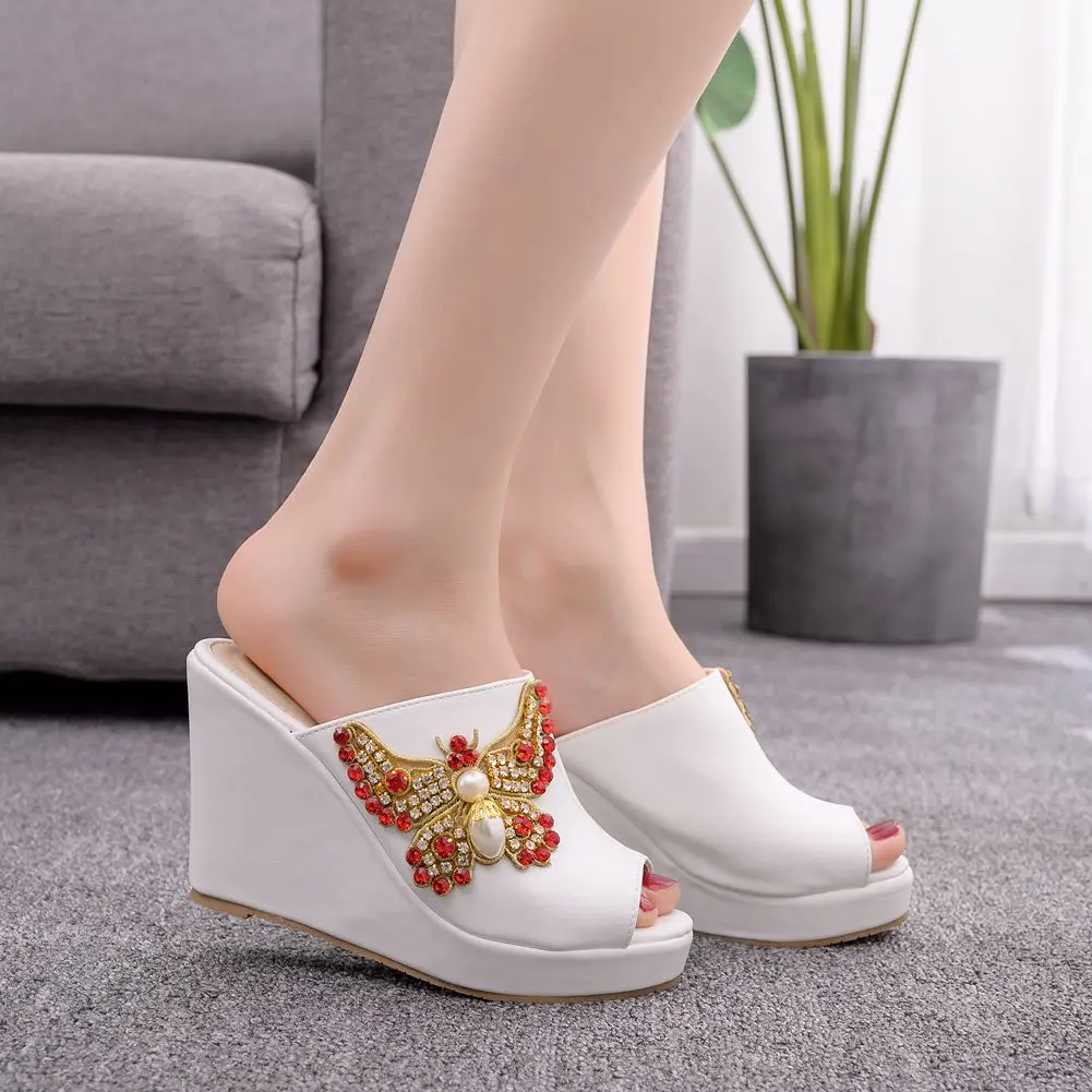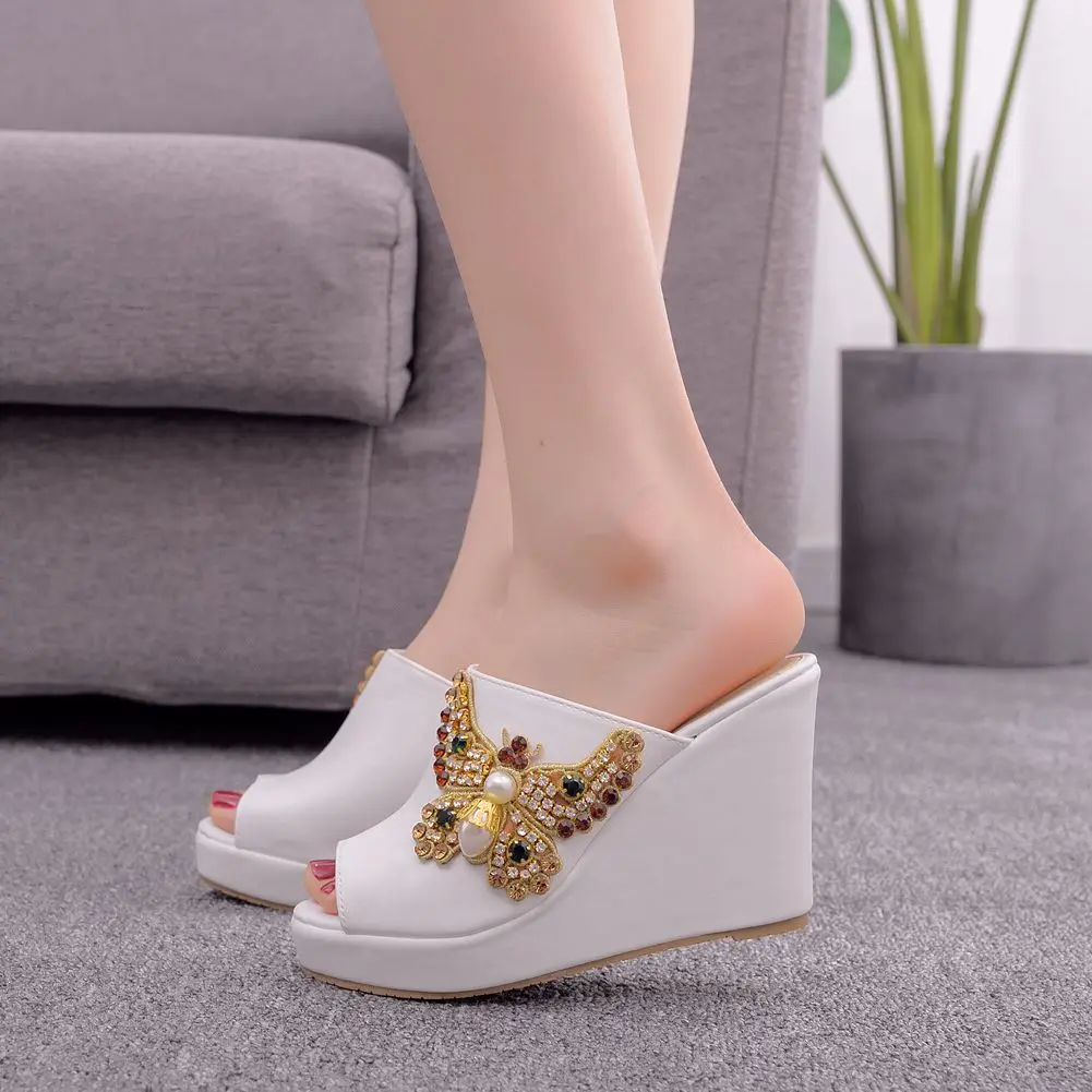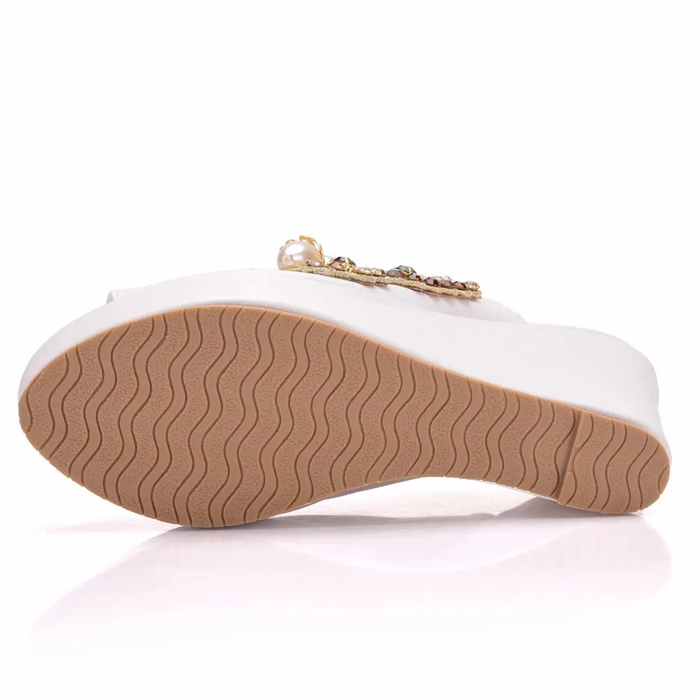 Color: WHITE, Shoe Size: 35 - Crystal Queen 10cm Peep Toe Platform Wedges Slippers High Heels Beach Sandals Women