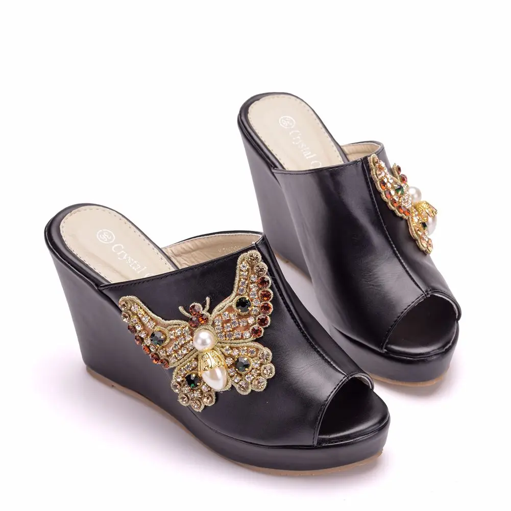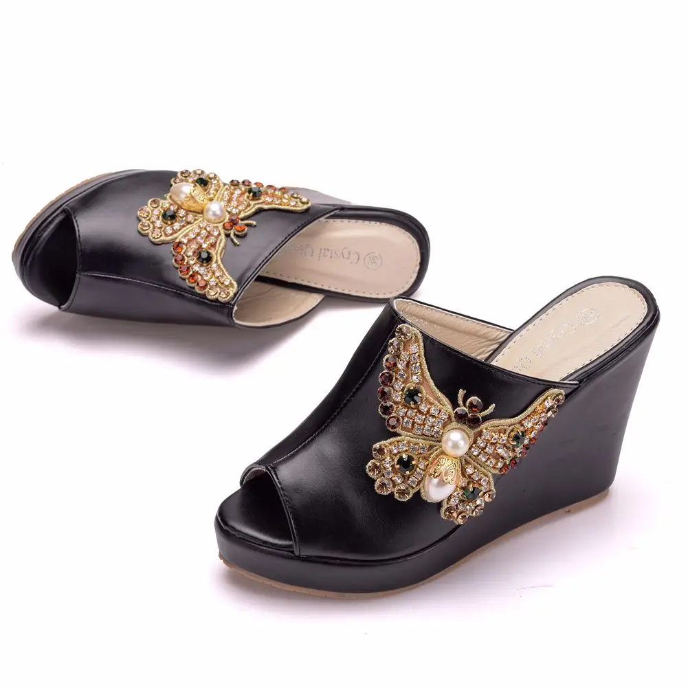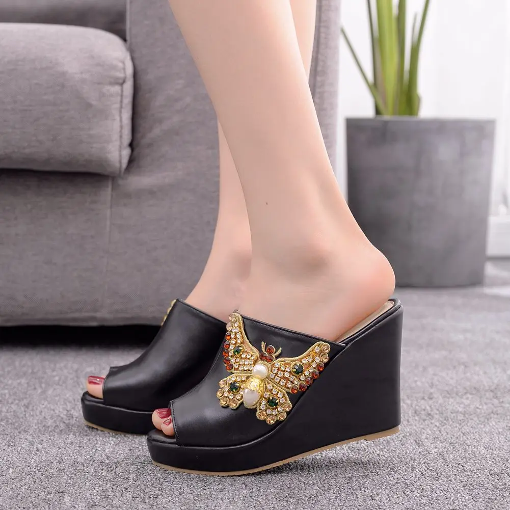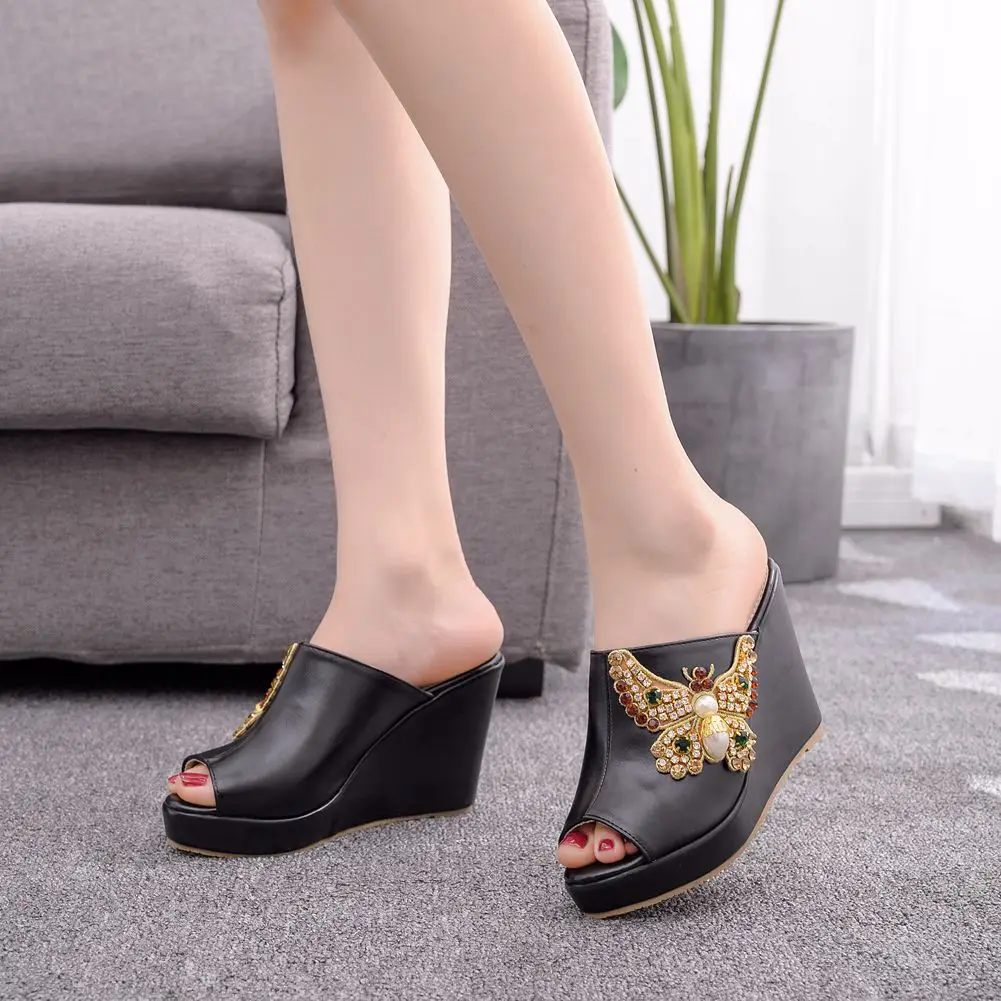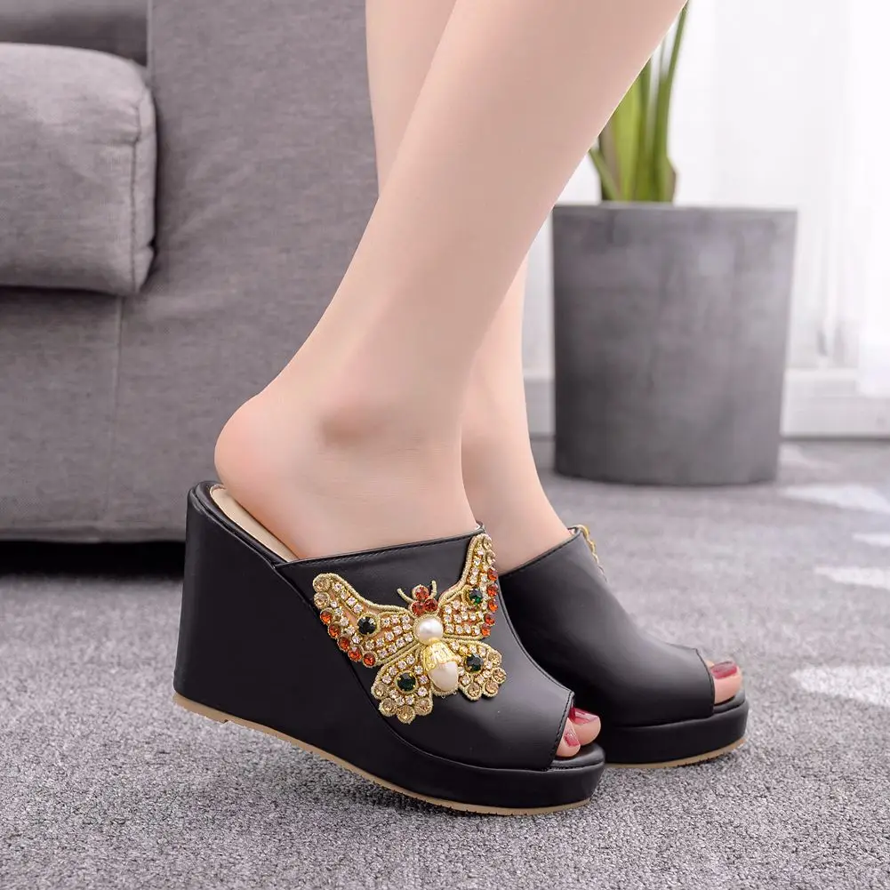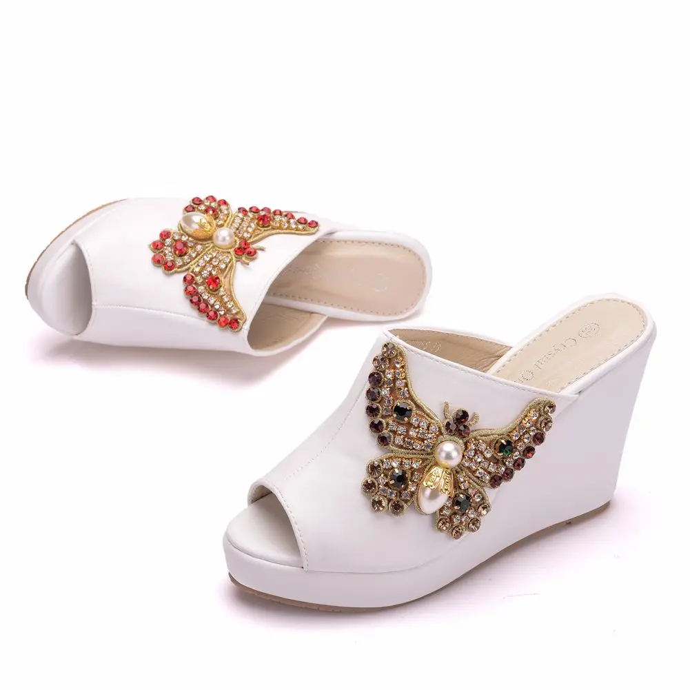 Color: WHITE, Shoe Size: 35 - Crystal Queen 10cm Peep Toe Platform Wedges Slippers High Heels Beach Sandals Women