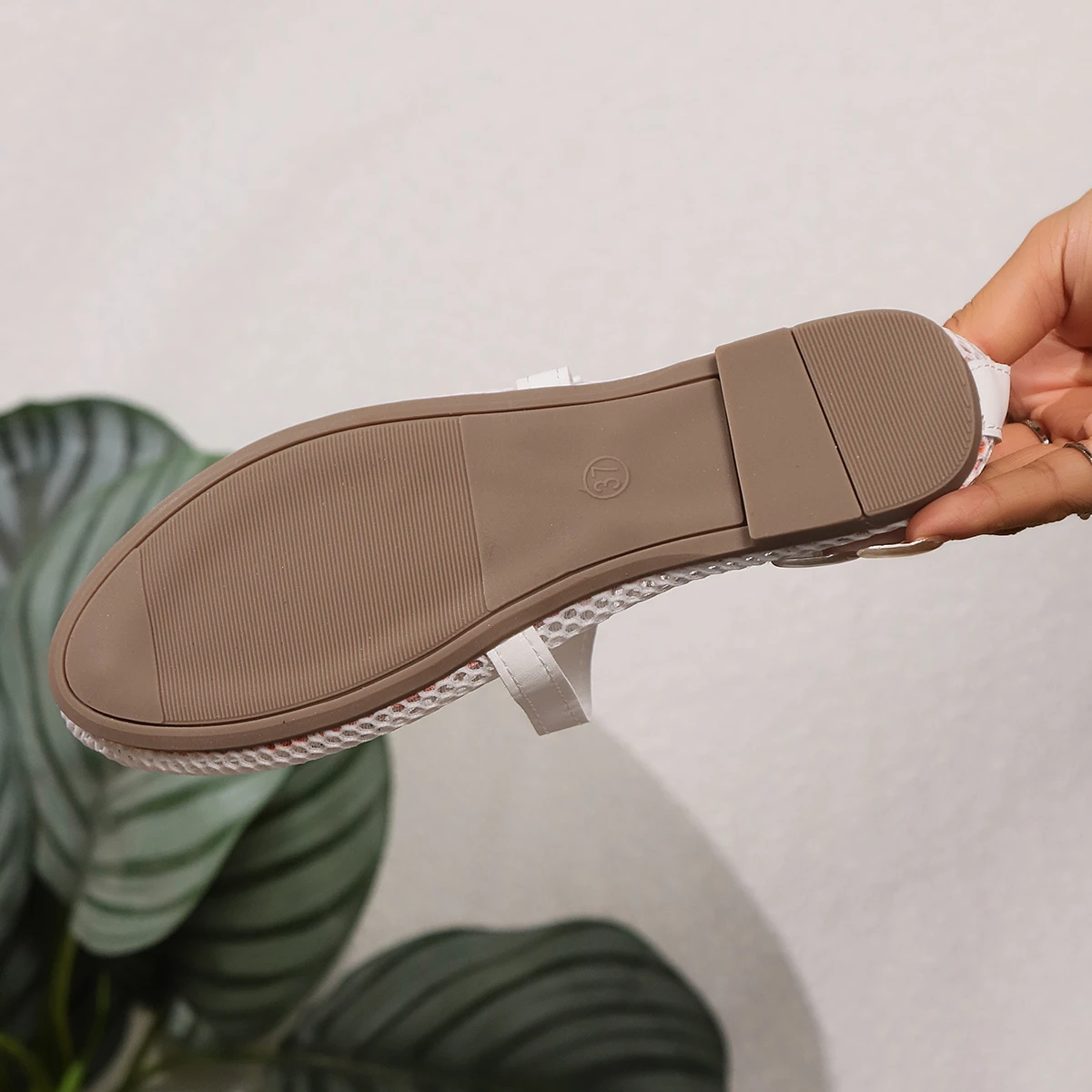 Color: WHITE, Shoe Size: 40 - Round head one buckle strap ballet shoes women's soft bottom flat hollow Mary Jane single fishing net shoes