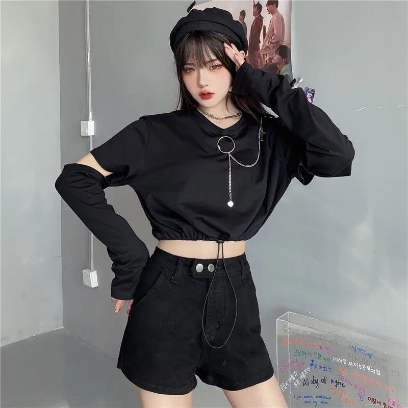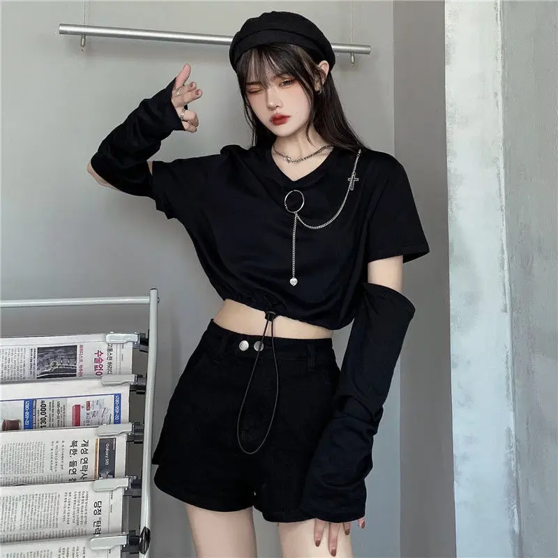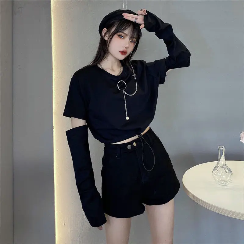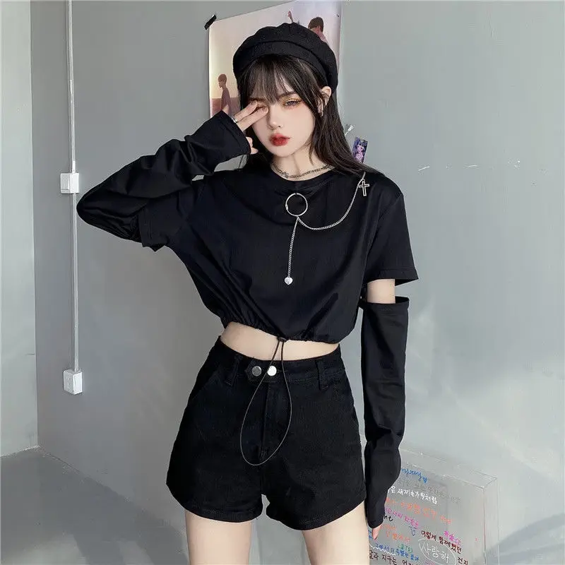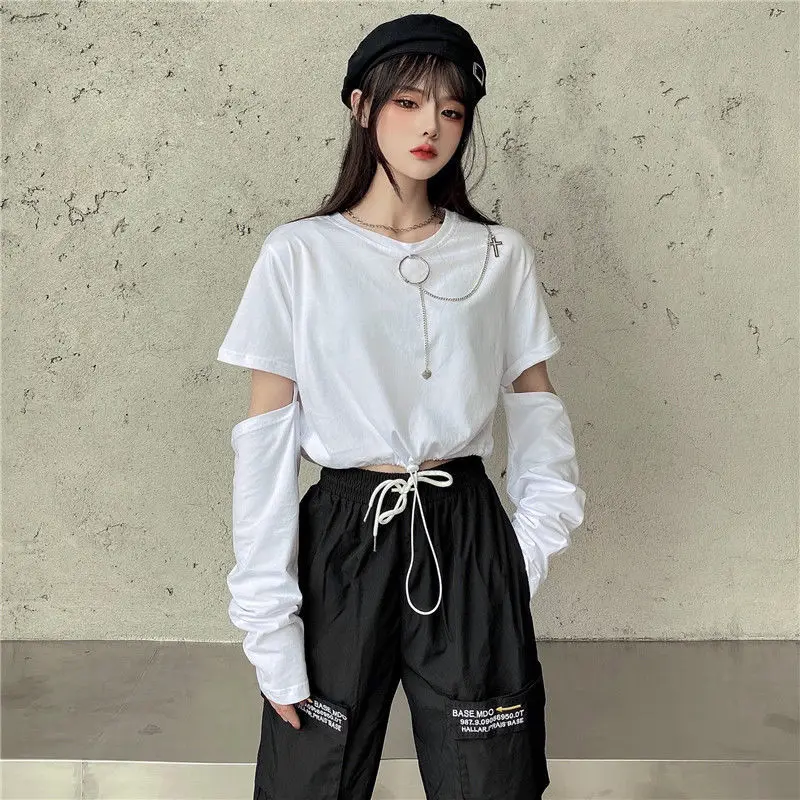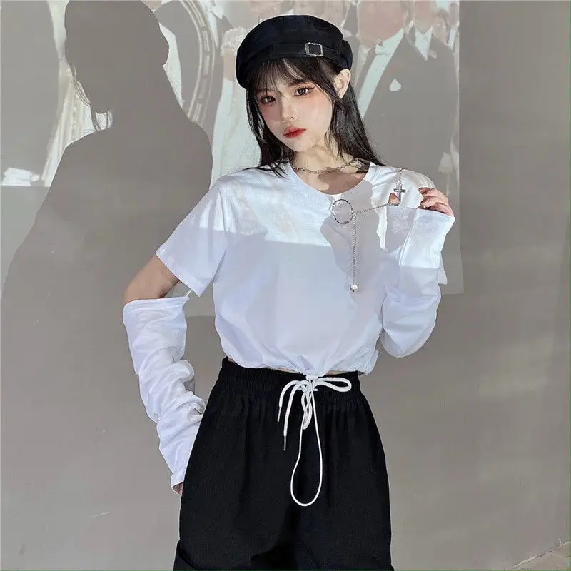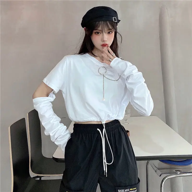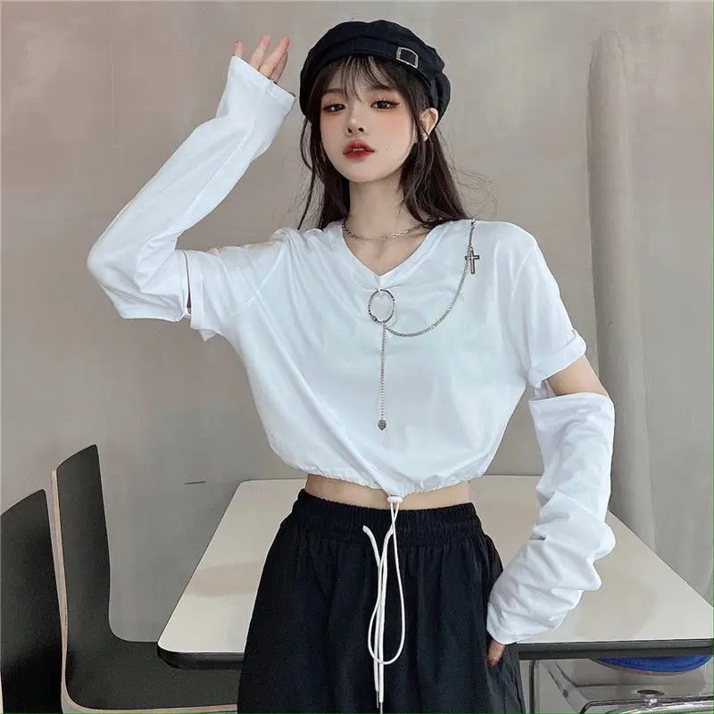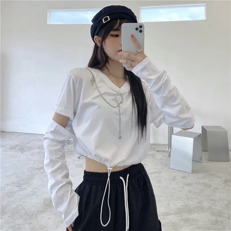 Color: WHITE, Size: L - Solid T-shirts Women Removable Sleeve Sequined Chain Japanese Style Harajuku Trendy Goth Y2k Female Crop Top Hot Sale Popular