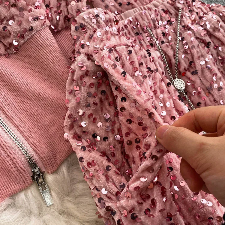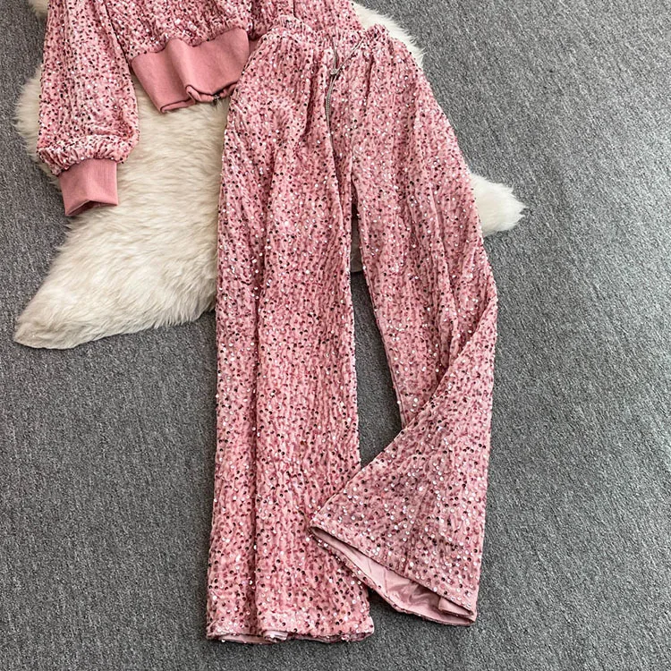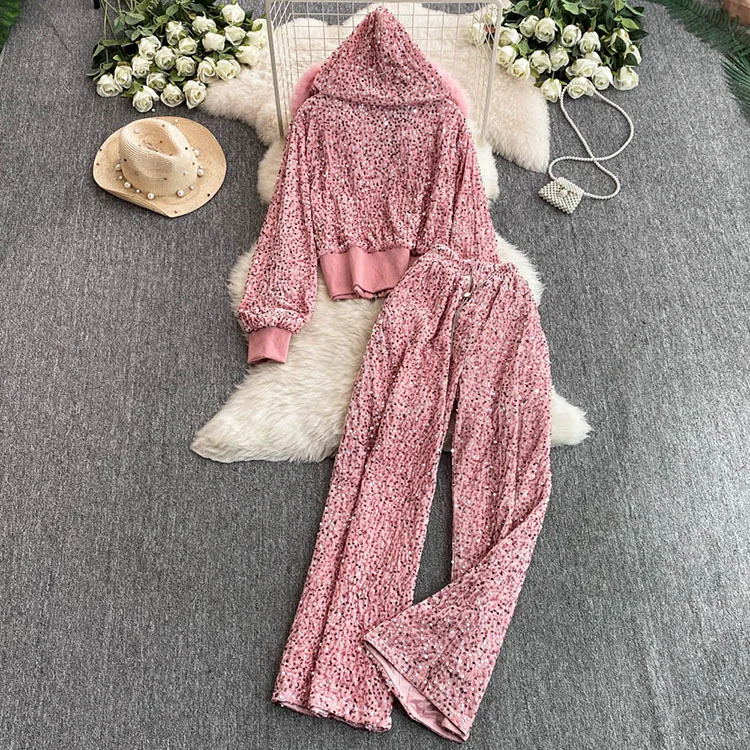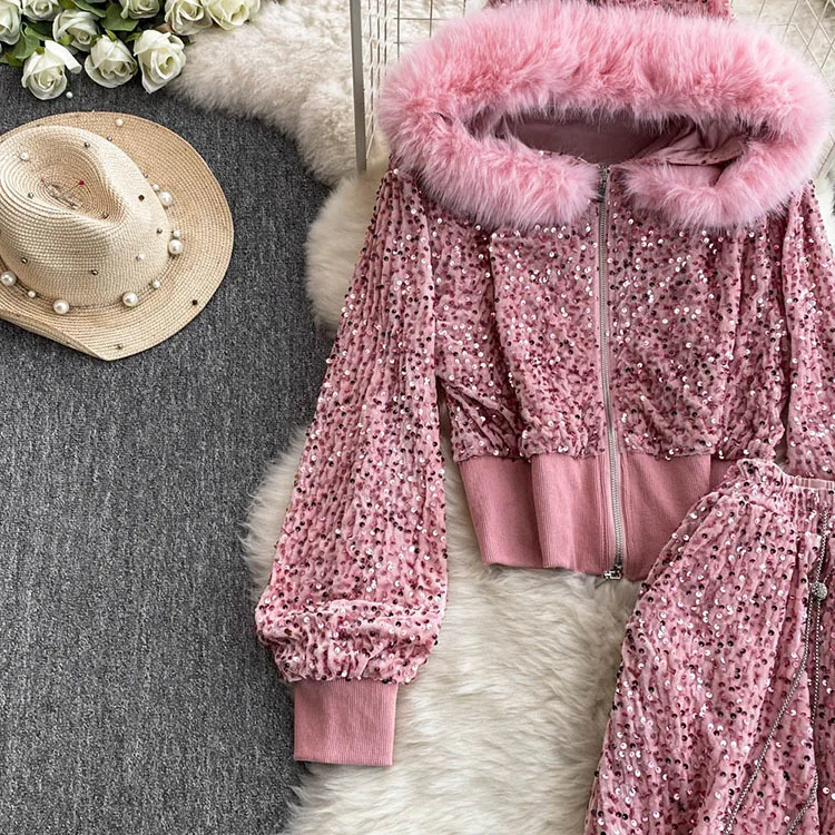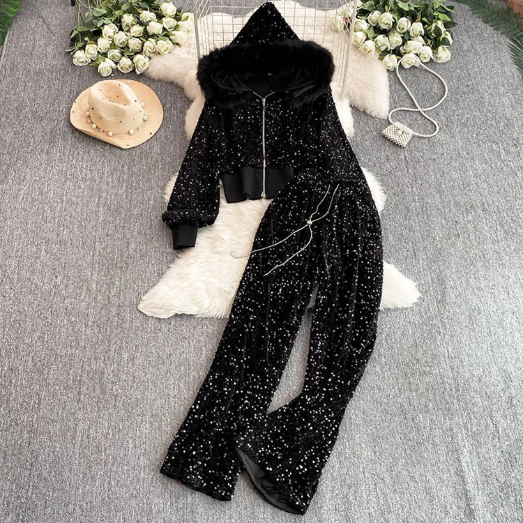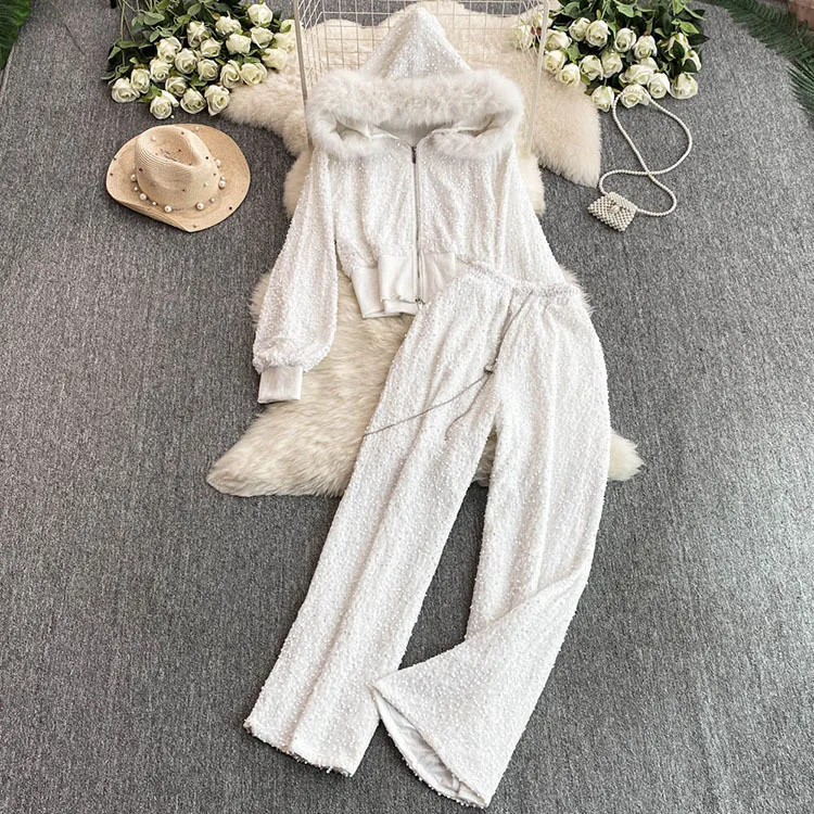 Color: WHITE, Size: One Size - Fashion Velvet Casual Suit Winter Clothes New Sweet Sequins Hooded Fur Collar Sweatshirt Wide Leg Pants Ladies Two-Piece Set