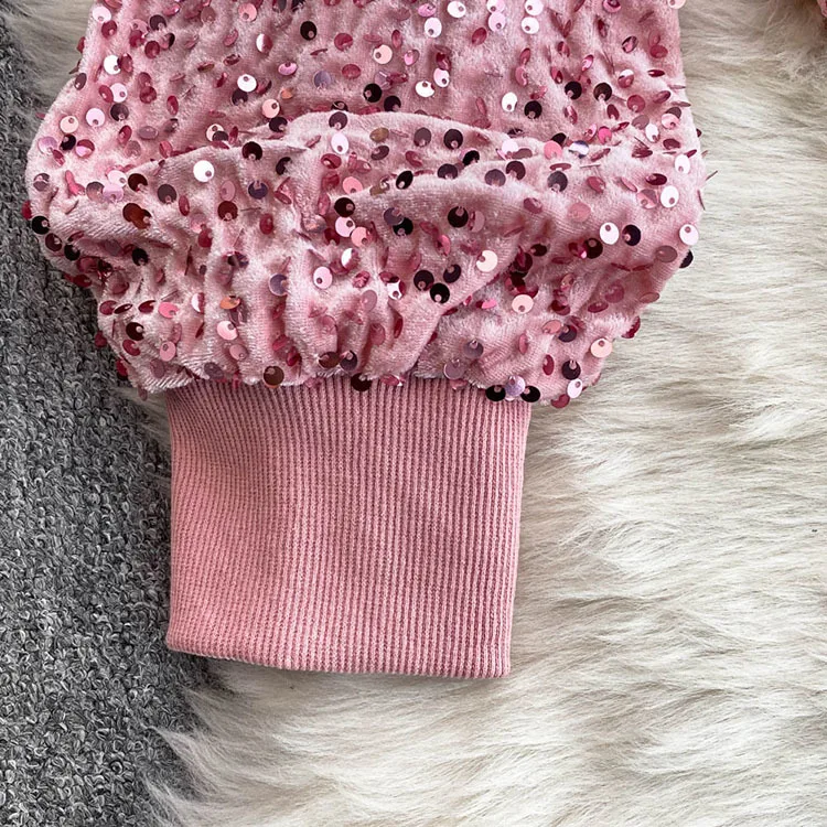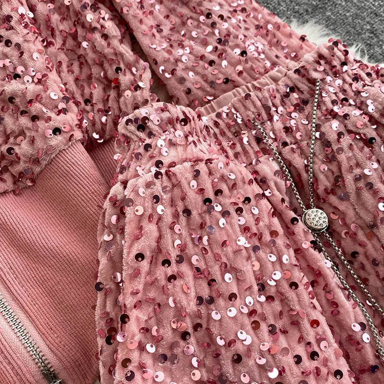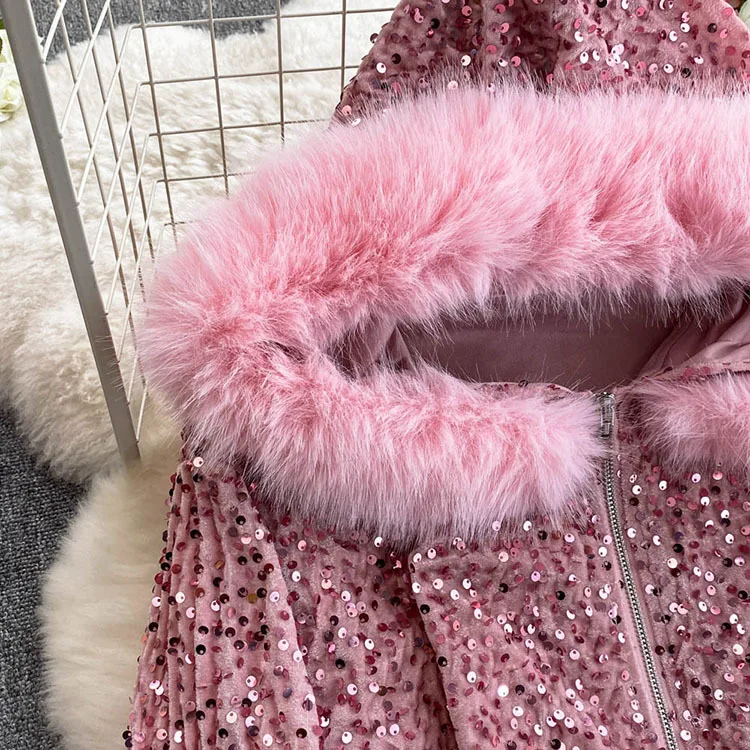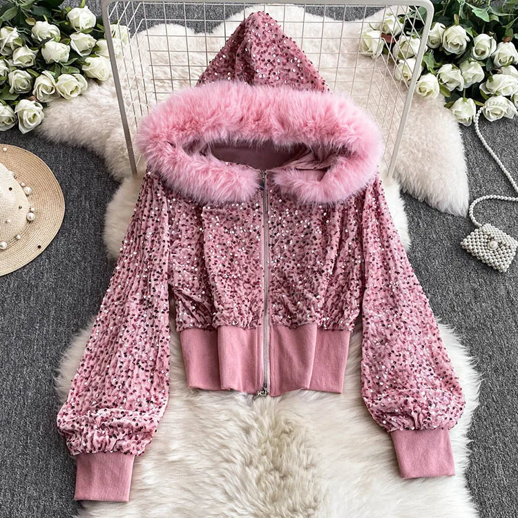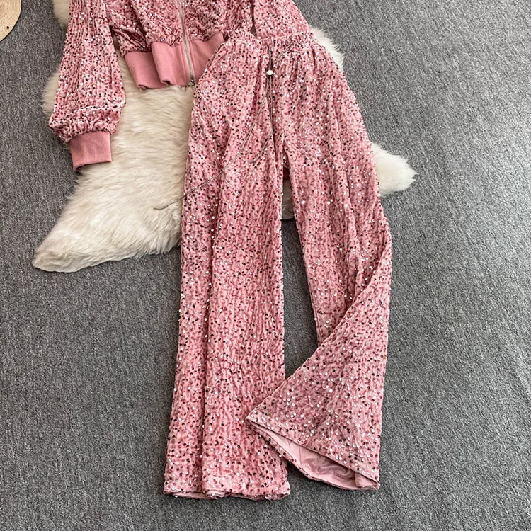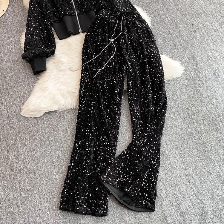 Color: WHITE, Size: One Size - Fashion Velvet Casual Suit Winter Clothes New Sweet Sequins Hooded Fur Collar Sweatshirt Wide Leg Pants Ladies Two-Piece Set