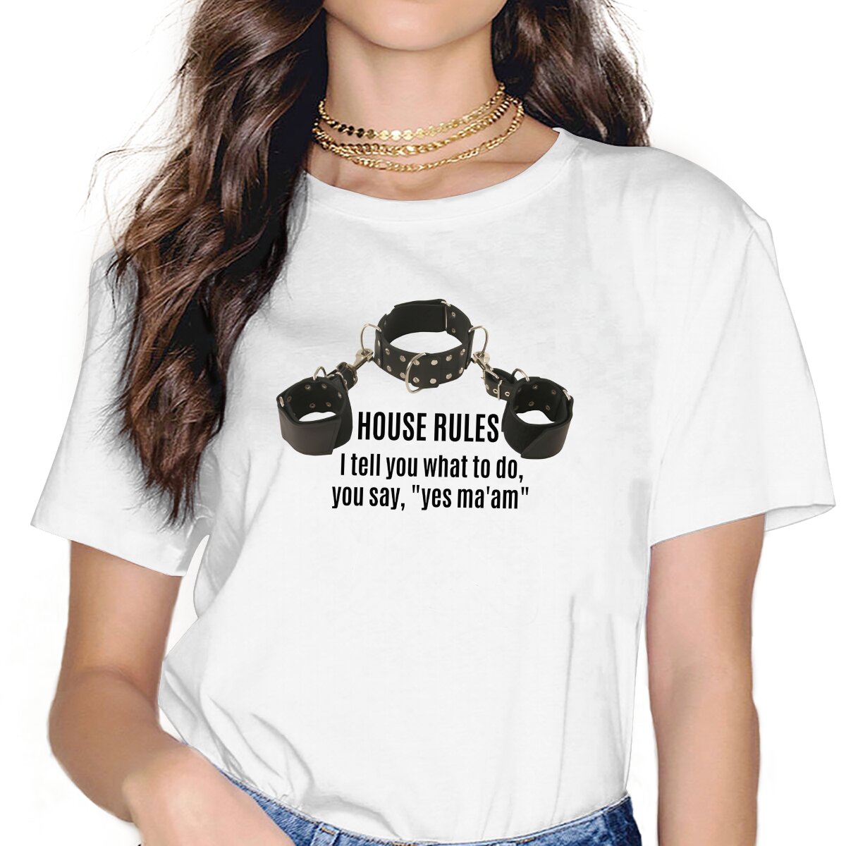 Color: WHITE, Size: S - BDSM Bondage Discipline Dominance Submission Polyester TShirts Collar Cuffs House Rules Female Print Homme T Shirt Hipster Tops