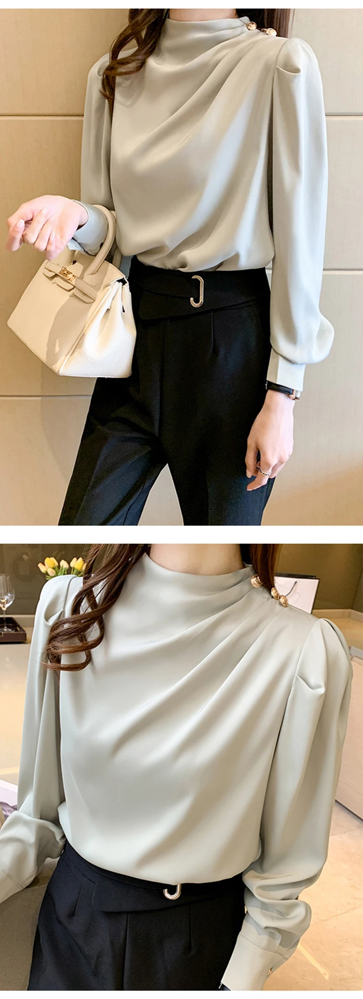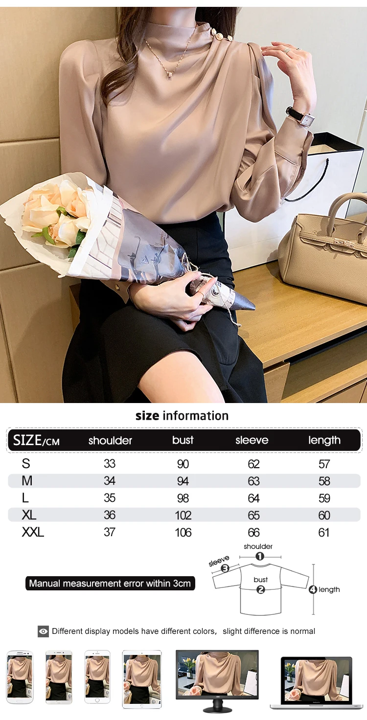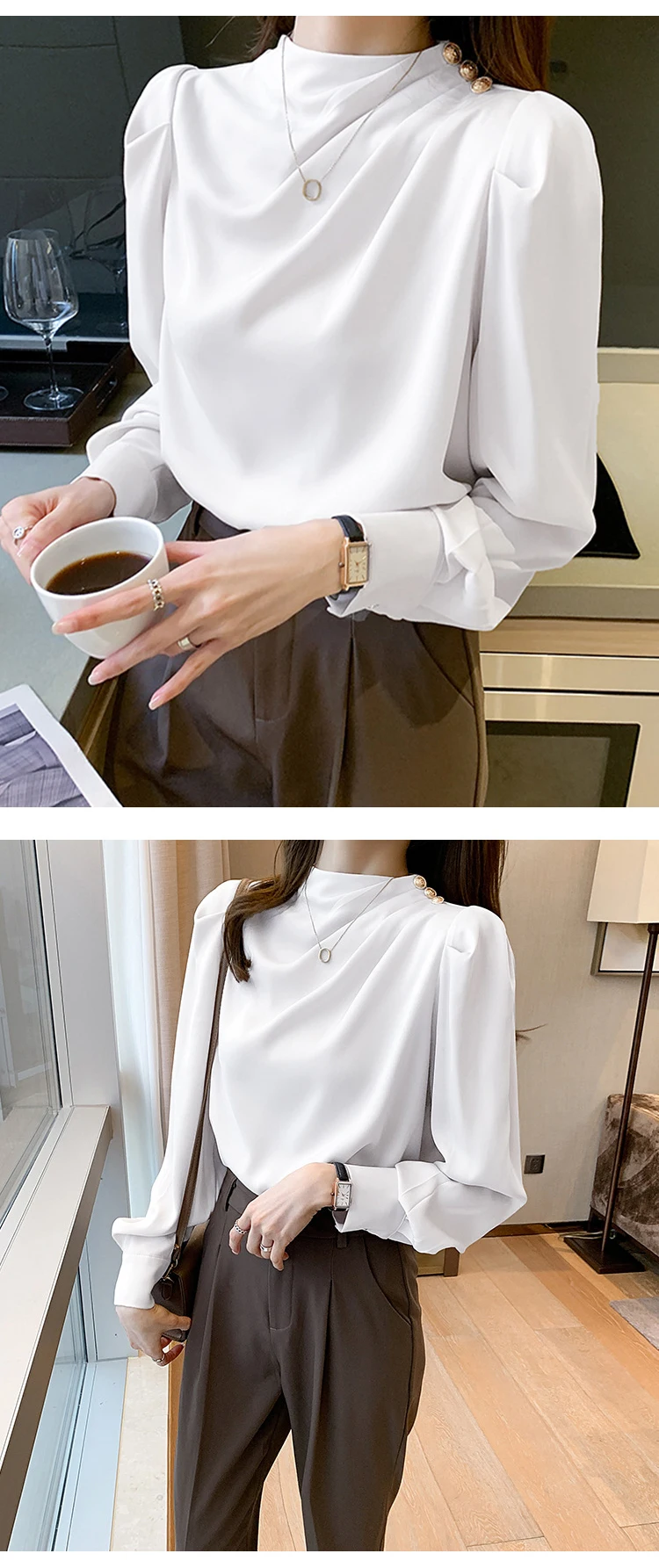 Color: WHITE, Size: S, Ships From: CHINA - Spring Autumn Elegant Office Women Shirt Mujer Chic Satin Formal Lantern Sleeve Blouse Tops Loose Pullover Jumper Street Clothes