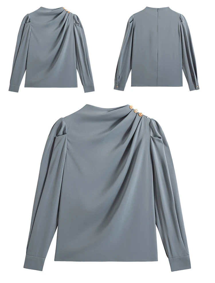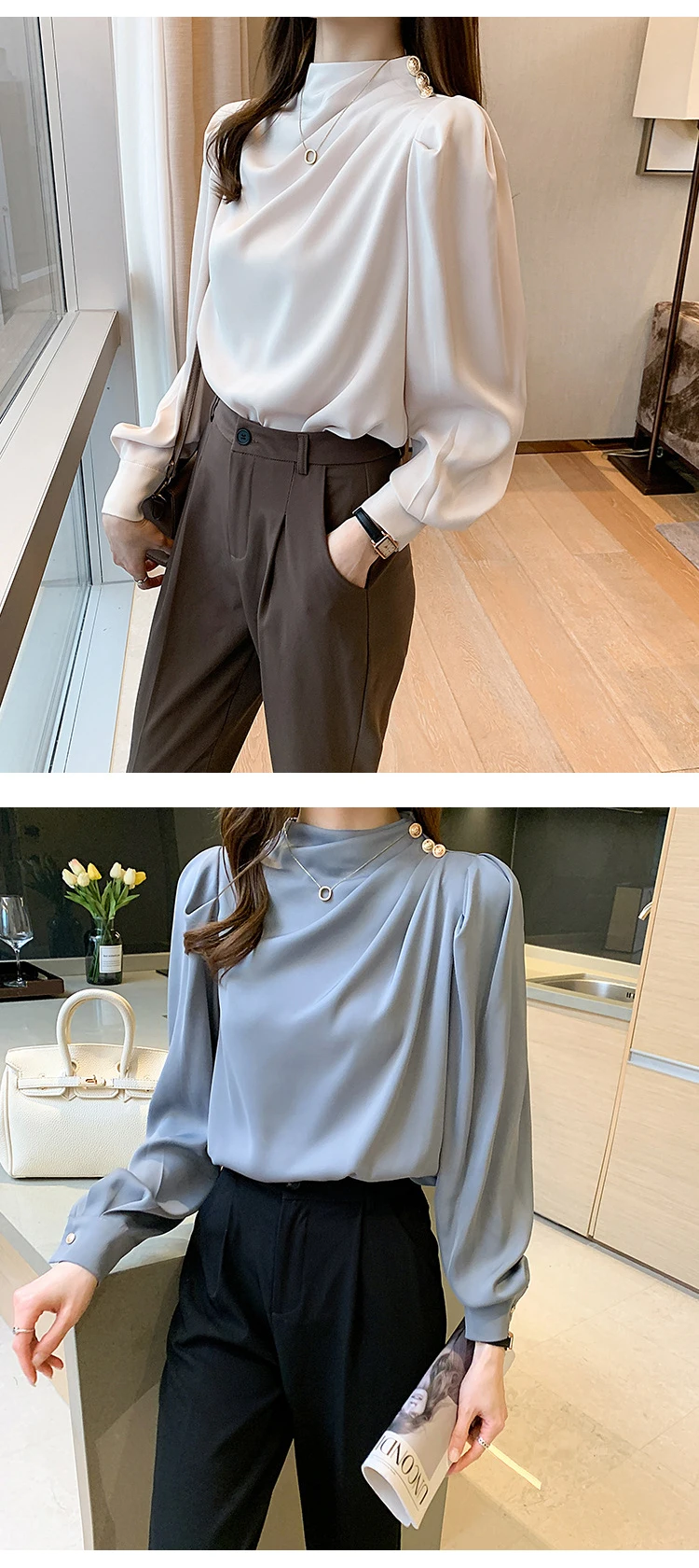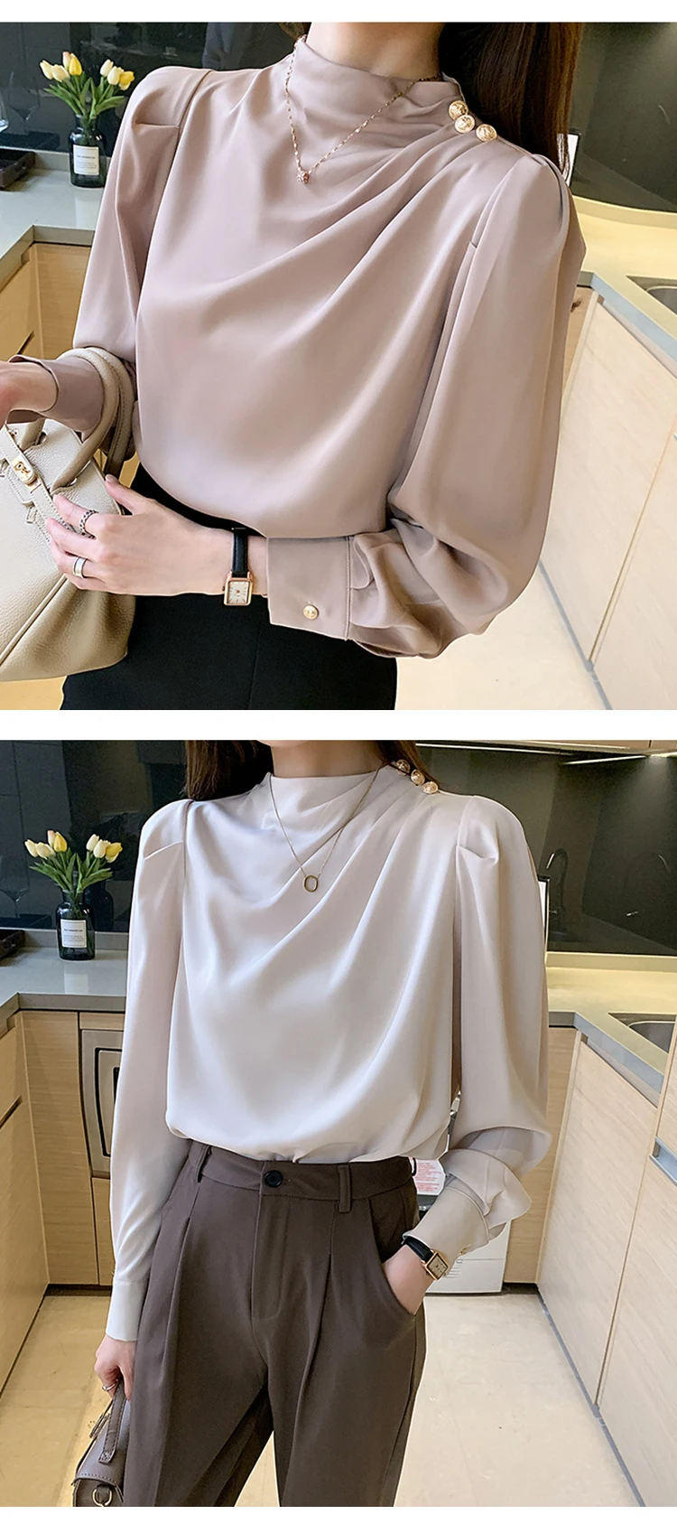 Color: WHITE, Size: S, Ships From: CHINA - Spring Autumn Elegant Office Women Shirt Mujer Chic Satin Formal Lantern Sleeve Blouse Tops Loose Pullover Jumper Street Clothes