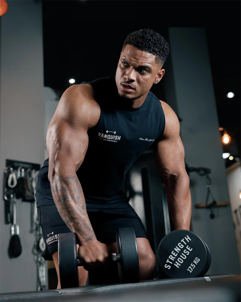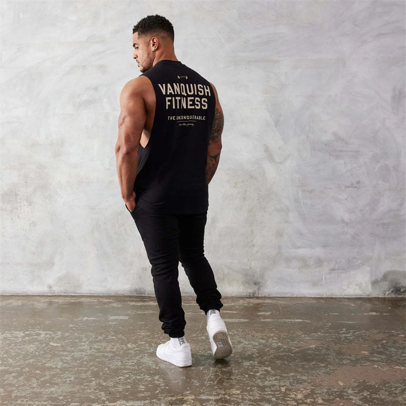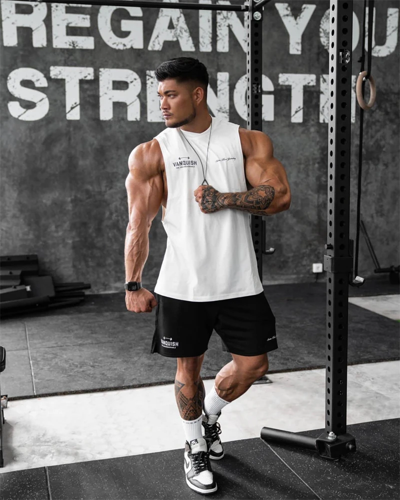 Color: WHITE, Size: XL - Gym exercise fitness sports men's vest cotton wide shoulder round neck sleeveless shirt slim casual men's wear