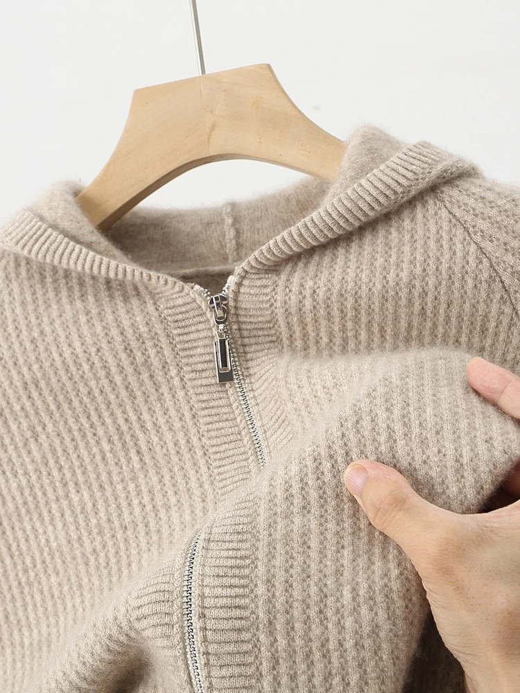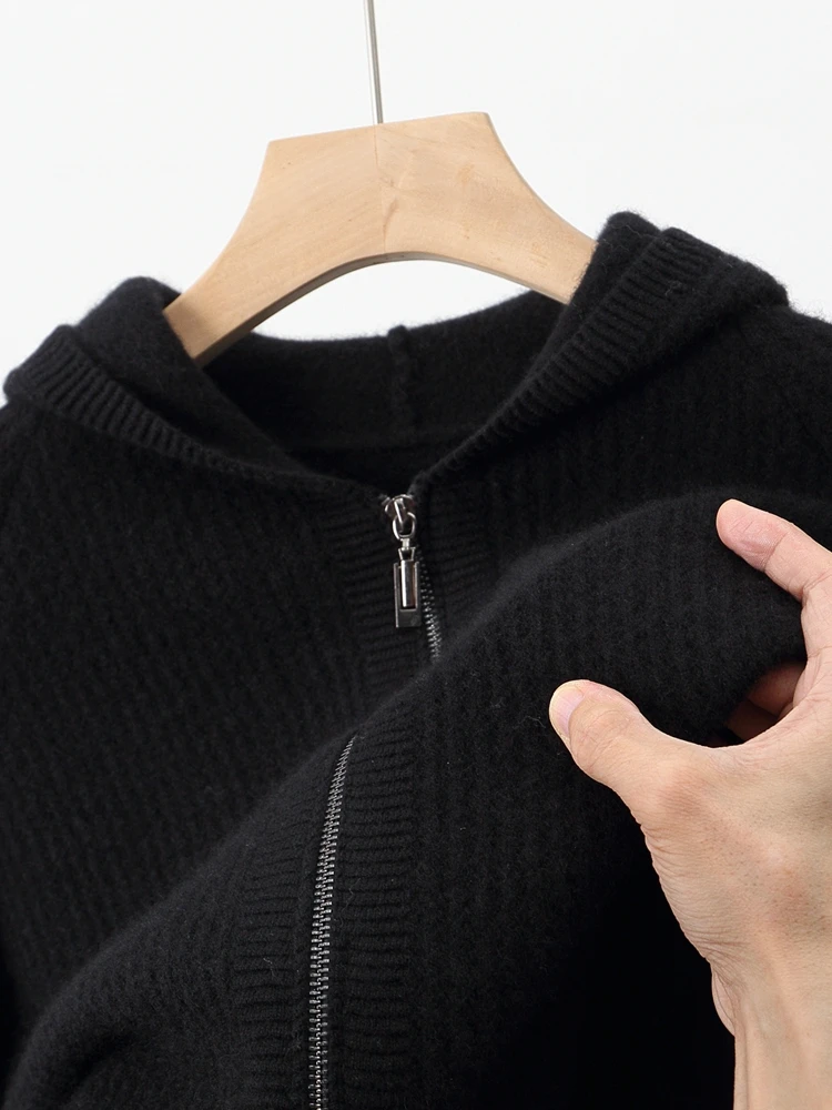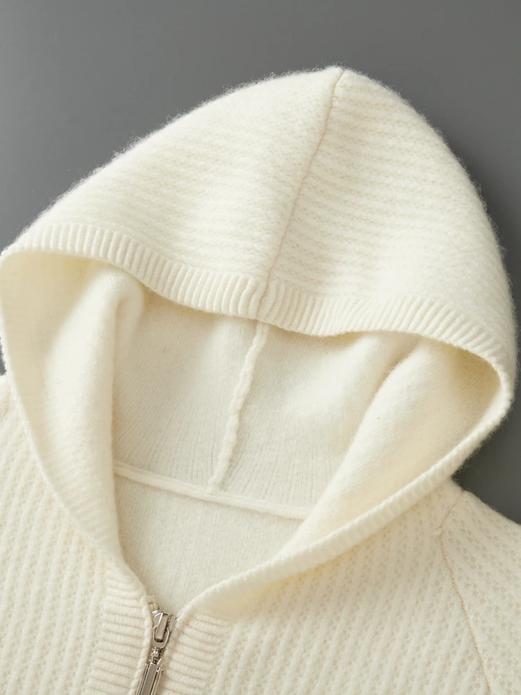 Color: WHITE, Size: XXL - Daily Clothes Autumn Winter Sweater Men's Coat 100% Merino Wool Sweater Cardigan Knitted Jacket Thicked Hooded Outerwears Trend
