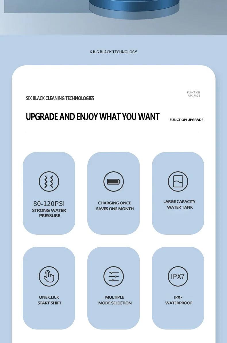 3.The water jet toothpick is IPX7 full body waterproof and designed with a 220ml capacity water tank, which has a good lifespan and is convenient for daily use without a second fill needed;
