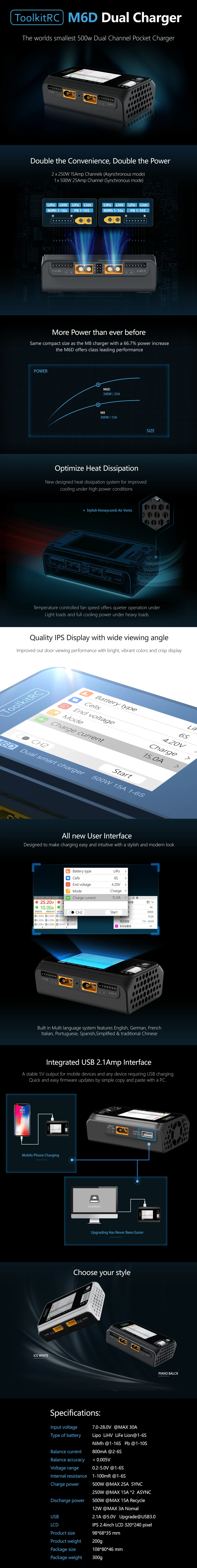 ToolkitRC - M6D Compact Dual Channel 250w 15A x 2 DC Charger