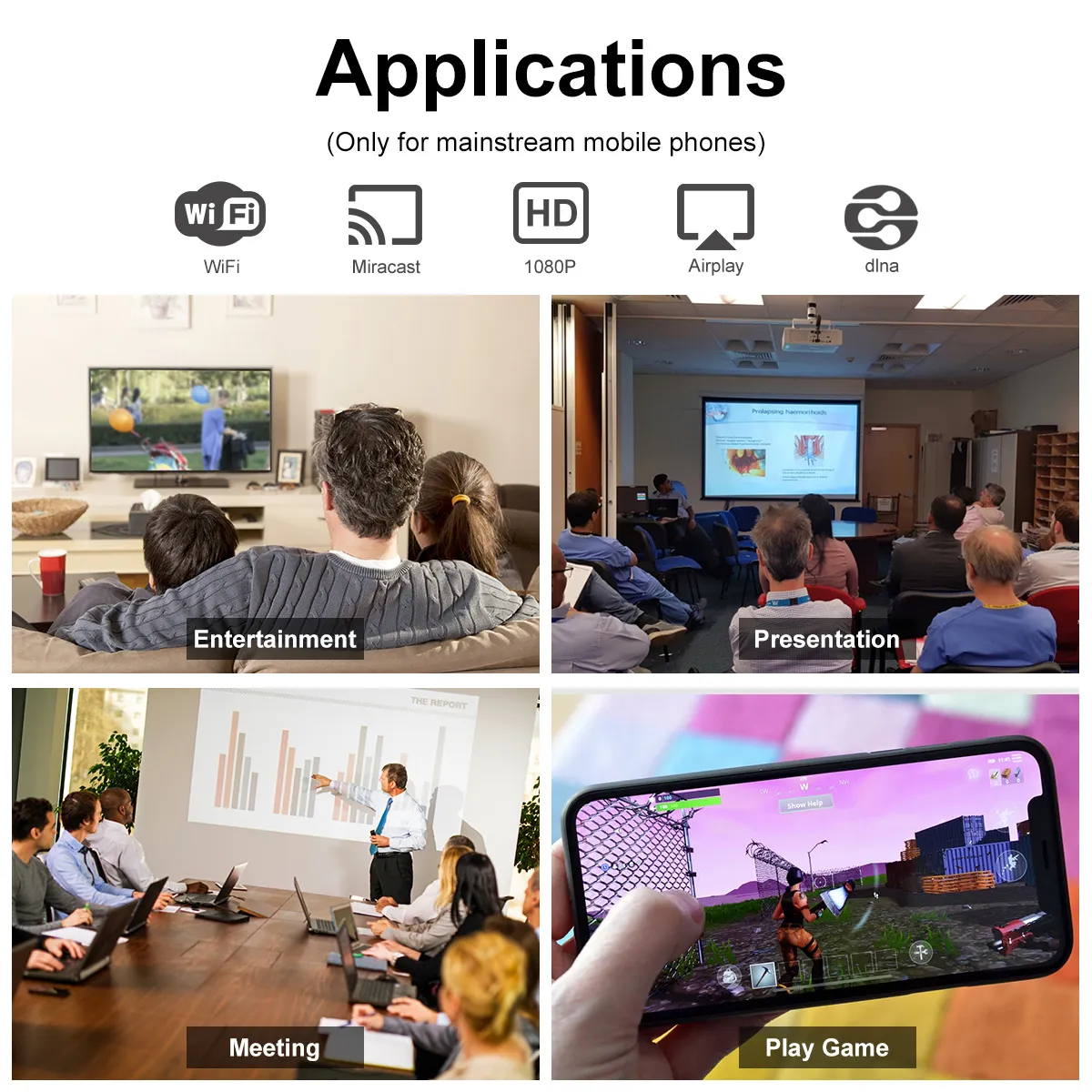 Wireless Screen Mirroring: This projector allows you to wirelessly mirror your mobile phone's screen to any HDMI-compatible