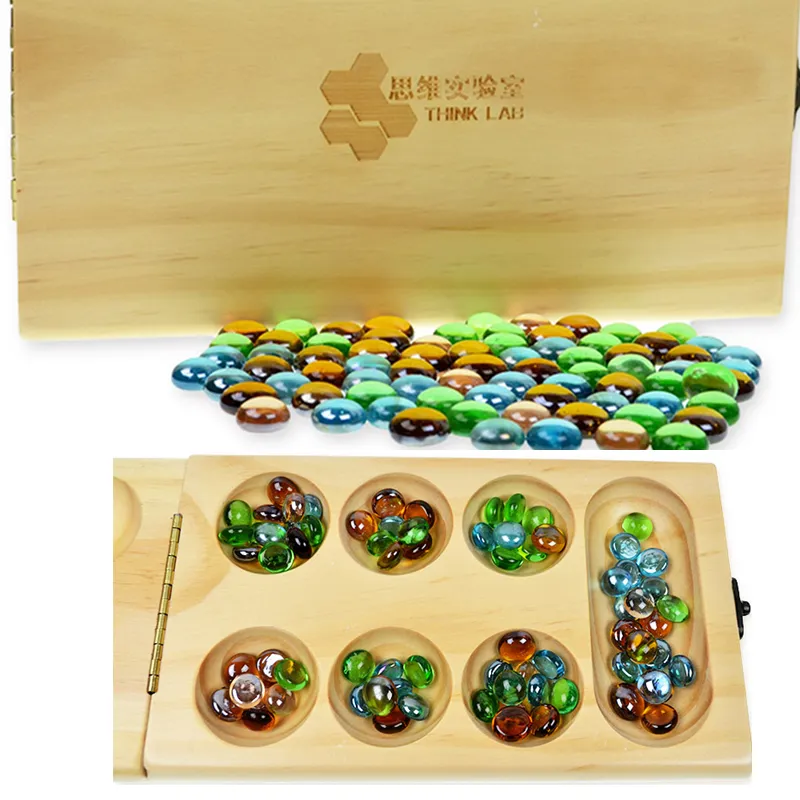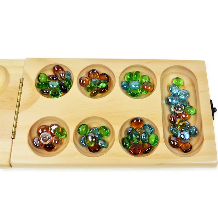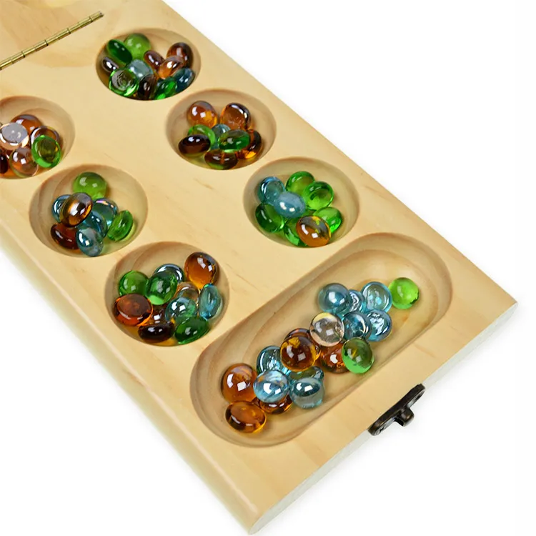 each end called the "store." The game comes with small, smooth stones, seeds, or beads to be moved across the pits. It is often beautifully