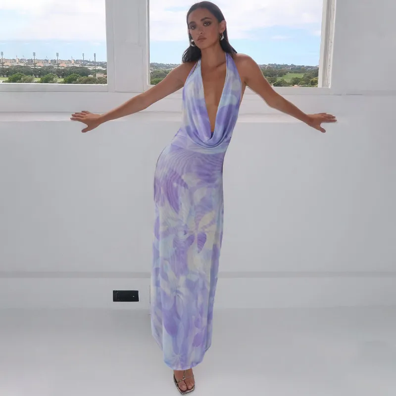 Conjunto de 2 piezas con cuello en V profundo y estampado tie-dye, vestidos largos con espalda descubierta y cuello halter para fiesta en la playa, ropa de mujer