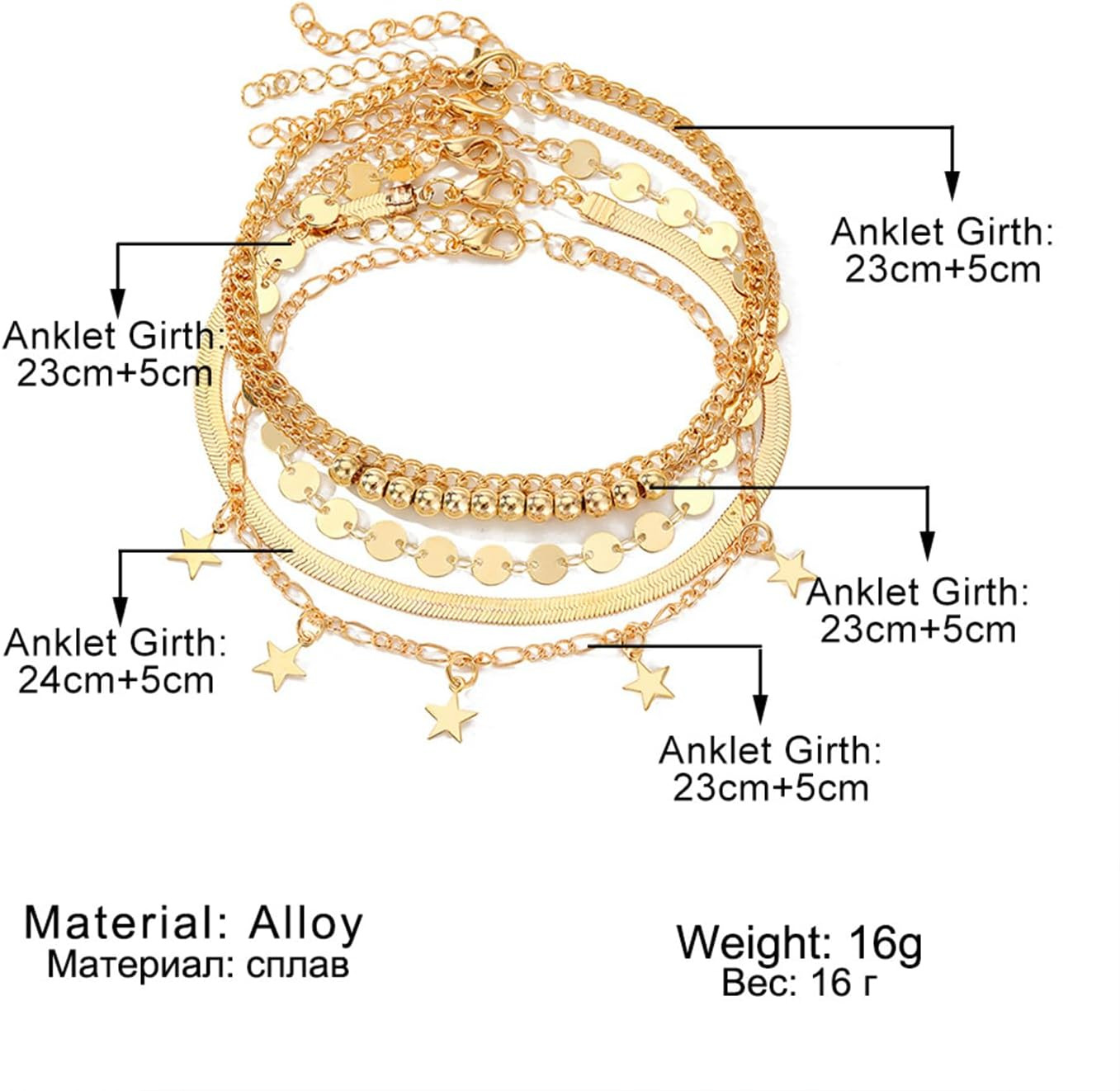 Descripción: Adéntrate en un mundo de elegancia y estilo con el Conjunto de Tobilleras Multicapa Sueños Celestiales, una impresionante colección de tobilleras diseñadas para añadir un toque de glamour a tu ropa de playa o a tus looks de diario. Este exquisito conjunto cuenta con múltiples capas, incluyendo una elegante cadena de eslabones cubanos, una delicada cadena de oblea, una elegante cadena de espiga, una encantadora cadena de cuentas y una divertida cadena con dije de estrella. Cada tobillera está elaborada con materiales de alta calidad y tiene un acabado dorado radiante, lo que garantiza durabilidad y un brillo duradero.