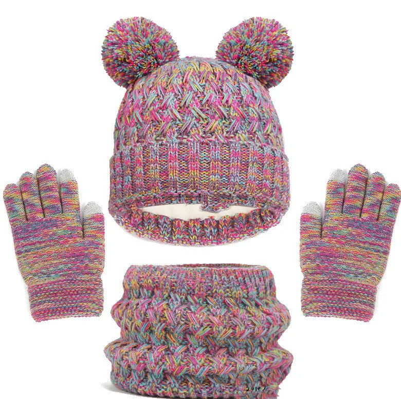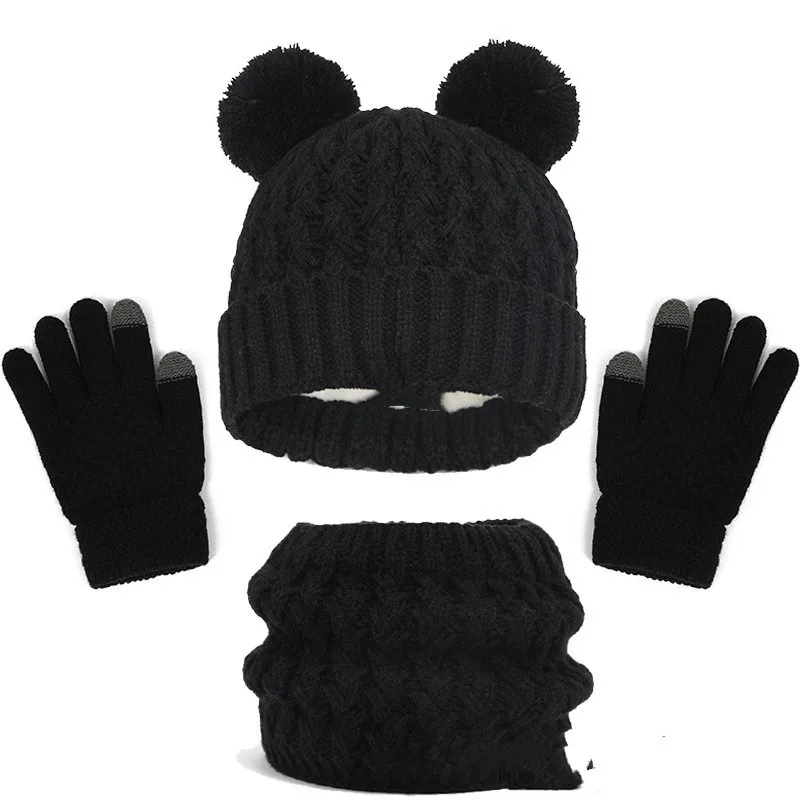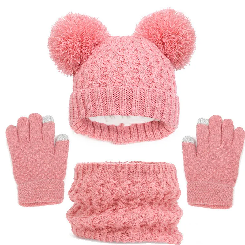 Conjunto de tres piezas de gorro, bufanda y guantes con doble bola gruesa y forro polar para niños, otoño e invierno