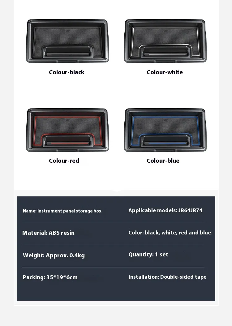 La Caja de almacenamiento con soporte para teléfono móvil para consola de modificación cuenta con un soporte para teléfono móvil integrado que sujeta tu teléfono de forma segura mientras conduces. Esto garantiza que puedas acceder fácilmente a tu teléfono para navegar o hacer llamadas con manos libres sin tener que buscarlo a tientas. La bandeja también ofrece amplio espacio para guardar otros artículos pequeños como cambio, bolígrafos o multas de aparcamiento, manteniendo el interior de tu coche limpio y organizado. Ya sea que estés en un viaje largo o un recado rápido, este sistema de bandeja y soporte ofrece una solución sencilla y segura para guardar tus artículos, manteniendo tu dispositivo móvil visible y accesible. Mejora la organización y funcionalidad de tu coche. Esta caja de almacenamiento está diseñada para maximizar el espacio de la consola de tu vehículo. Con una bandeja bien organizada y secciones dedicadas para diferentes artículos, puedes eliminar el desorden y mantener el interior de tu coche ordenado. El soporte para teléfono móvil garantiza que tu dispositivo se mantenga seguro, evitando distracciones mientras conduces. El diseño multiusos de la bandeja también la hace ideal para guardar pequeños dispositivos, monedas, gafas de sol y otros artículos esenciales a los que necesitas acceder rápidamente durante tu viaje. Perfecta para quienes buscan mejorar la funcionalidad de su coche, esta caja de almacenamiento te ayuda a mantener todo organizado sin sacrificar la comodidad ni la accesibilidad. Duradera y fácil de instalar. La caja de almacenamiento con soporte para teléfono móvil y bandeja para salpicadero de consola de modificación está fabricada con materiales duraderos de alta calidad diseñados para soportar el uso diario. Su robusta construcción garantiza que la caja de almacenamiento se mantendrá segura y resistente, incluso en viajes con baches. El diseño es simple pero práctico, y el proceso de instalación es sencillo, sin necesidad de una configuración complicada. Esta caja de almacenamiento se adapta a la mayoría de las consolas de automóviles estándar, lo que la convierte en un complemento versátil para su vehículo. Descripción Material: Plástico Atributos del producto: Normal, Extra grande Tamaño del paquete: 350 x 190 x 60 (1 mm) Información del producto Nombre: Caja de almacenamiento para tablero Material: Resina ABS Embalaje: 35 x 19 x 6 cm Modelos de vehículos aplicables: JB64 JB74 Color: Negro, Blanco, Rojo, Azul Instalación: Cinta adhesiva de doble cara />