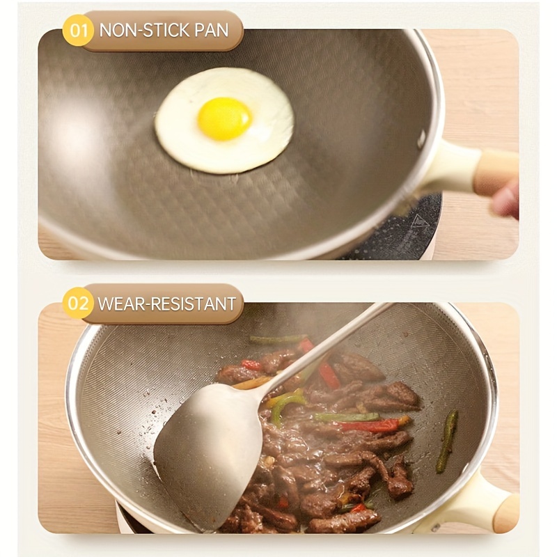 The wok’s multi-layer construction blends aluminum alloy for fast heat conduction with a stainless-steel base for strength and induction compatibility. This combination provides consistently even heating, preventing hot spots and supporting high-heat stir-fry cooking.
