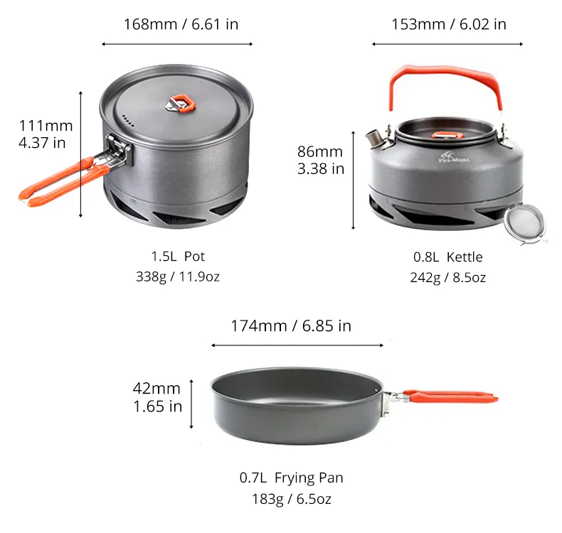 Dimensions: pot: 168 * 111mm, frying pan: 174 * 42mm, kettle: 153 * 86mm