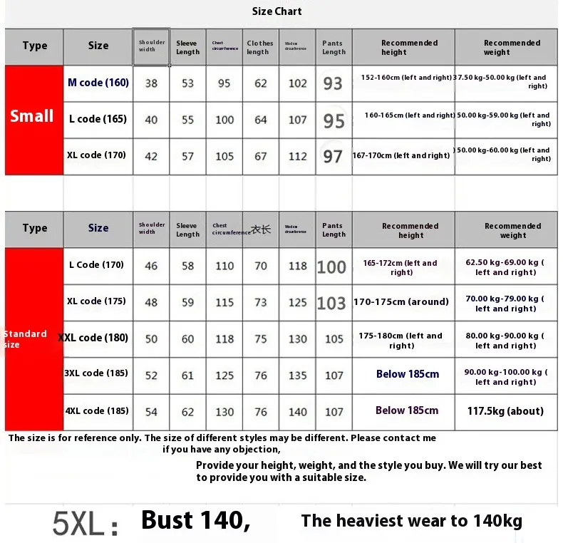 Size: L 170/50.00 kg-60.00 kg, XL 175/60.00 kg-70.00 kg, XXL 180/70.00 kg-80.00 kg, 3XL 185/80.00 kg-90.00 kg, 4XL 185/90.00 kg-100.00 kg,