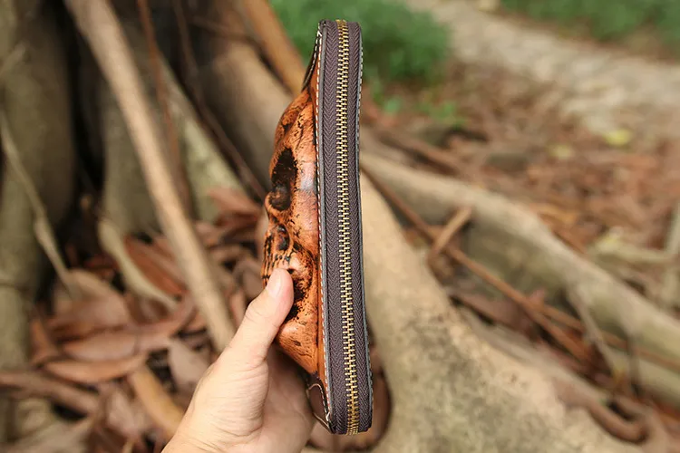 Cowhide Skull Ghost Head Men’s Zipper Wallet – Bold Style Meets Secure Functionality