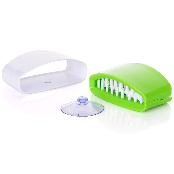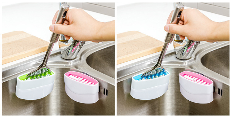 The brush features a strong suction cup base that allows you to attach it securely to sinks, counters, or other flat surfaces.