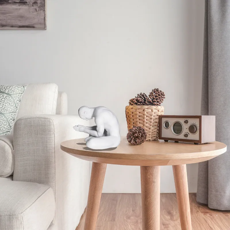 The figure features a seated posture, symbolizing prayer and devotion, with hands clasped together in reverence. The minimalist design focuses on serenity and spiritual reflection, making it ideal for creating a peaceful and contemplative atmosphere. This statue embodies the connection between body, mind, and spirit, offering an opportunity for deep reflection during moments of worship or personal meditation.