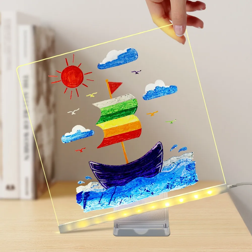 [Away from Screens] Clear acrylic dry erase board with light, it's cute and light design makes it appealing to children of all ages. You can create your artwork directly with 7 highlighters. It's not just a toy, but also a learning tool that stimulates creativity, imagination, concentration, and thinking ability. Keep your kids away from electronic screens.