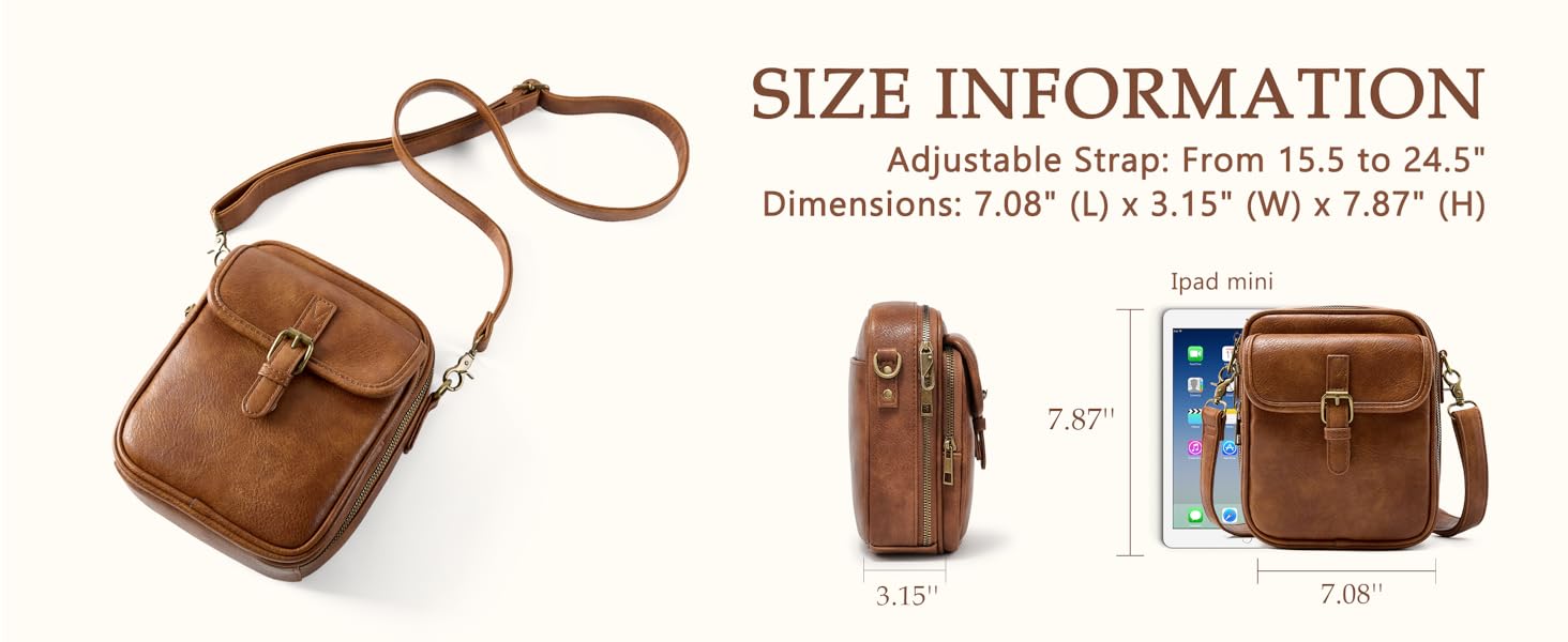 - Size: 7.08" (L) x 3.15" (W) x 7.87" (H). This lightweight crossbody bag features an adjustable strap with a height drop of 12.9"–23.6", allowing for versatile wear as a shoulder or crossbody bag
