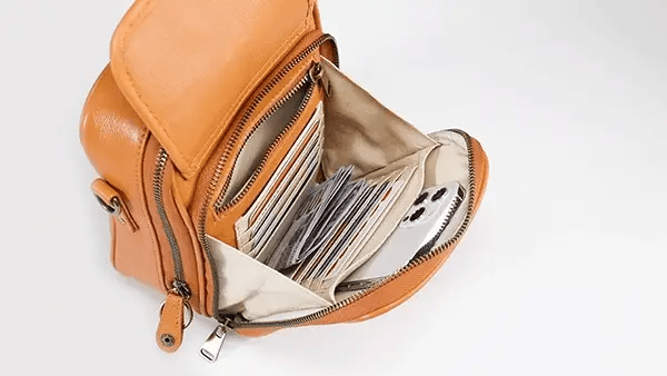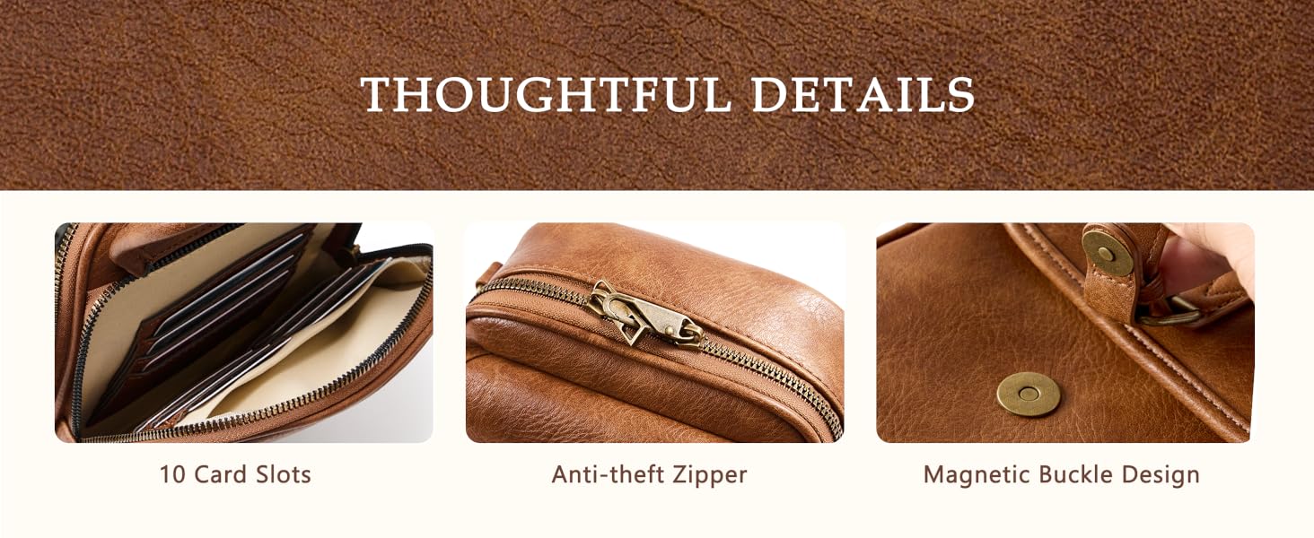 - Secure Card Slots: The front pocket is secured with a magnetic buckle and zipper closure for double-layer protection. Equipped with RFID-blocking technology, it safeguards your cards and IDs from digital theft while ensuring quick access