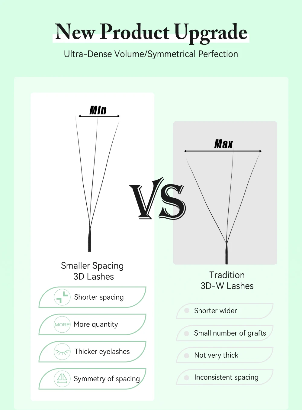 1. Small spacing 3D eyelashes. Compared with traditional 3D W eyelashes, this eyelash has a smaller opening and smoother lines.Adopting a compact arrangement design, the eyelash spacing is reduced and evenly distributed, resulting in a denser eyelash effect after use