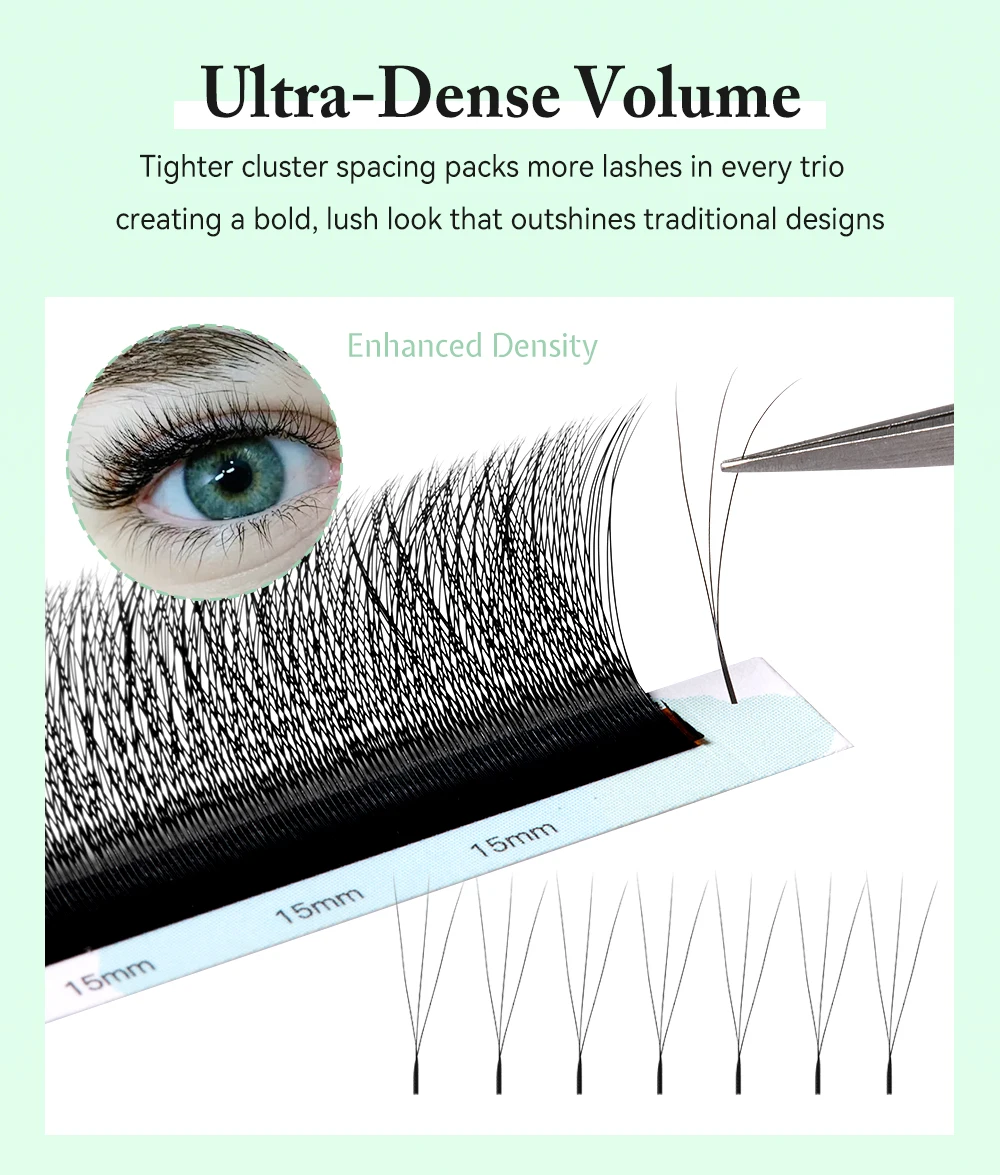 1. Small spacing 3D eyelashes. Compared with traditional 3D W eyelashes, this eyelash has a smaller opening and smoother lines.Adopting a compact arrangement design, the eyelash spacing is reduced and evenly distributed, resulting in a denser eyelash effect after use