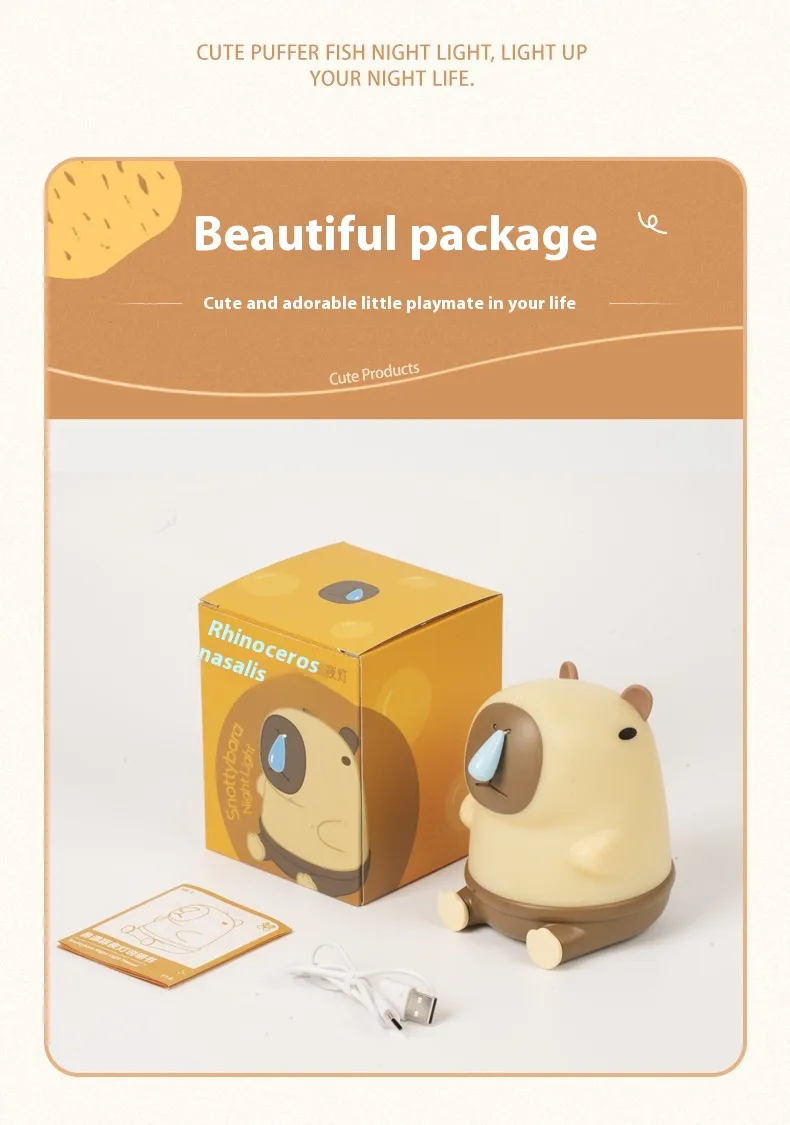 - Portable Rechargeable Capybara light:Capybara Night Light is equipped with a built-in 1200mAh rechargeable battery, 3000K warm light,Cordless,portable,USB rechargeable,you can take it anywhere after charging it,offering hours of continuous use on a single charge,You can take it camping, traveling,or use it as a desk lamp and emergency light,Capybara night light include:Capybara lamp,1 x USB cable,1 x user manual.