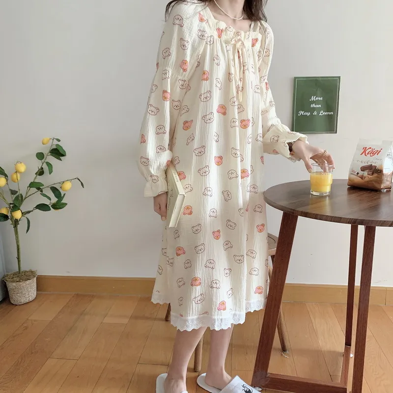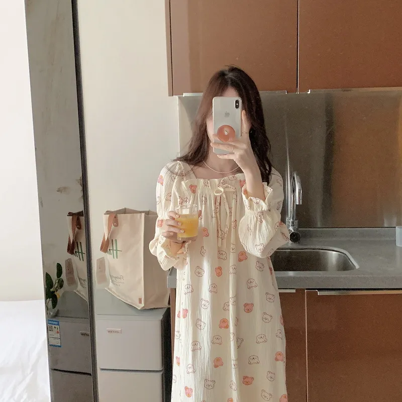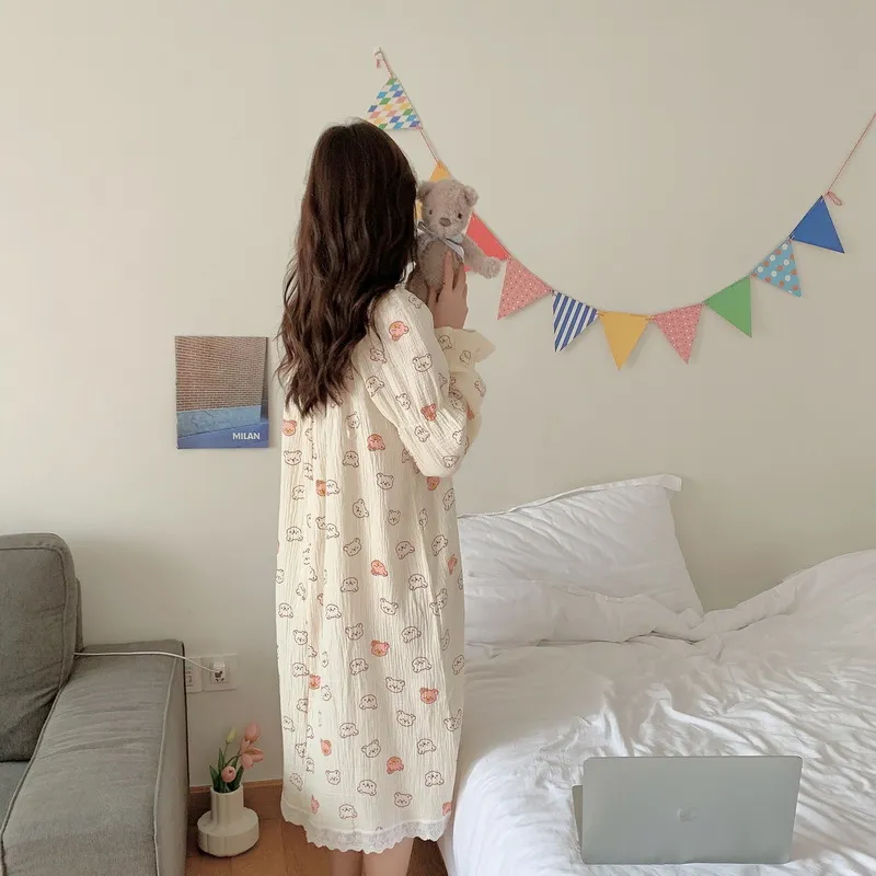 Cute Cartoon Bear Cotton Yarn Nightdress – Soft, Breathable & Adorable Women’s Homewear for NZ