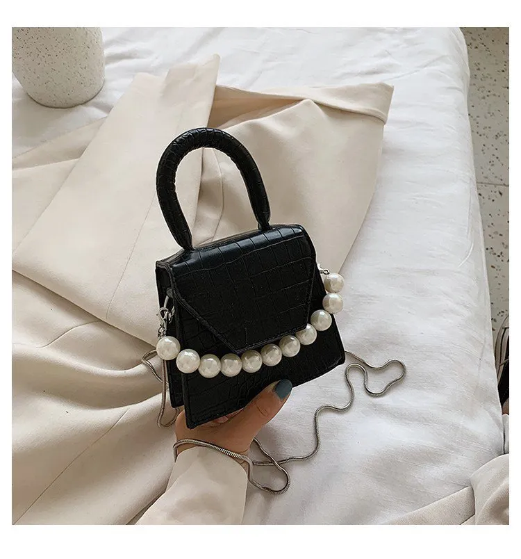 Elegant Pearl Detailing: The mini pouch is adorned with glistening pearl accents that