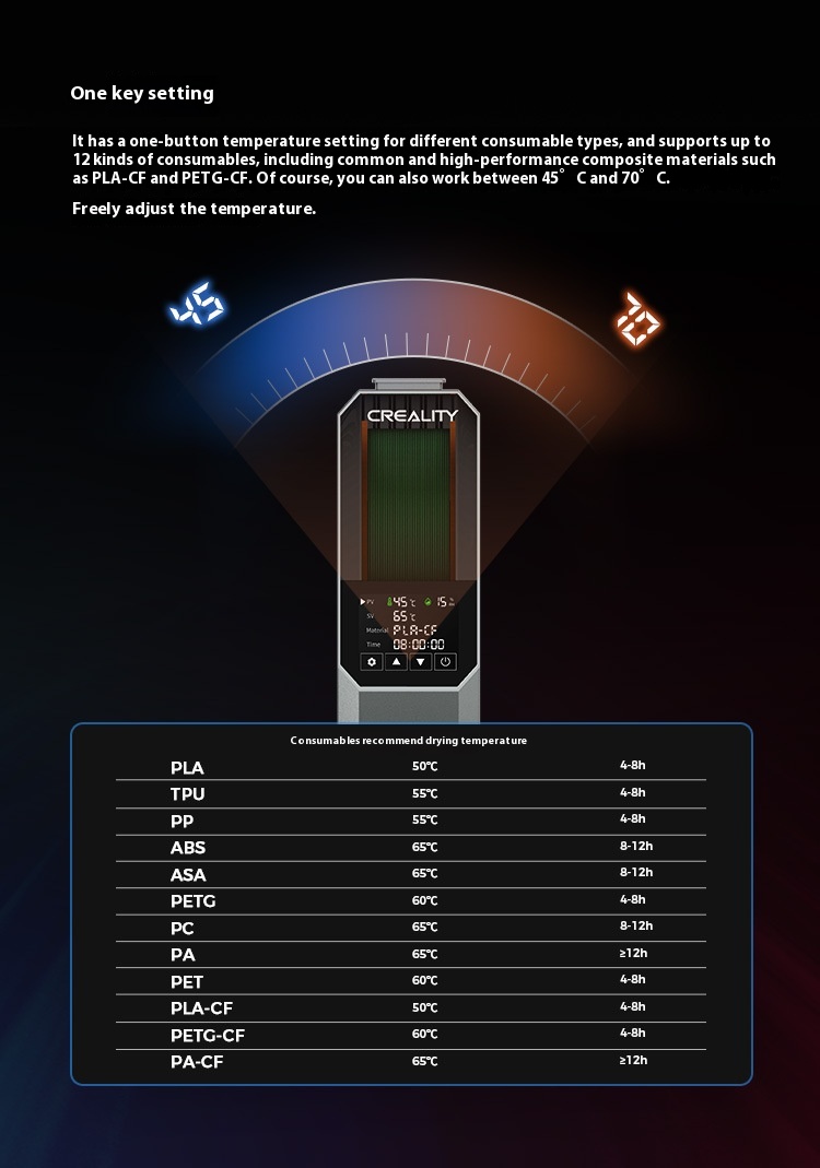 With adjustable temperature settings, the drying box is suitable for a variety of filaments, including PLA, ABS, PETG, TPU, and more, making it a versatile addition to your 3D printing setup.