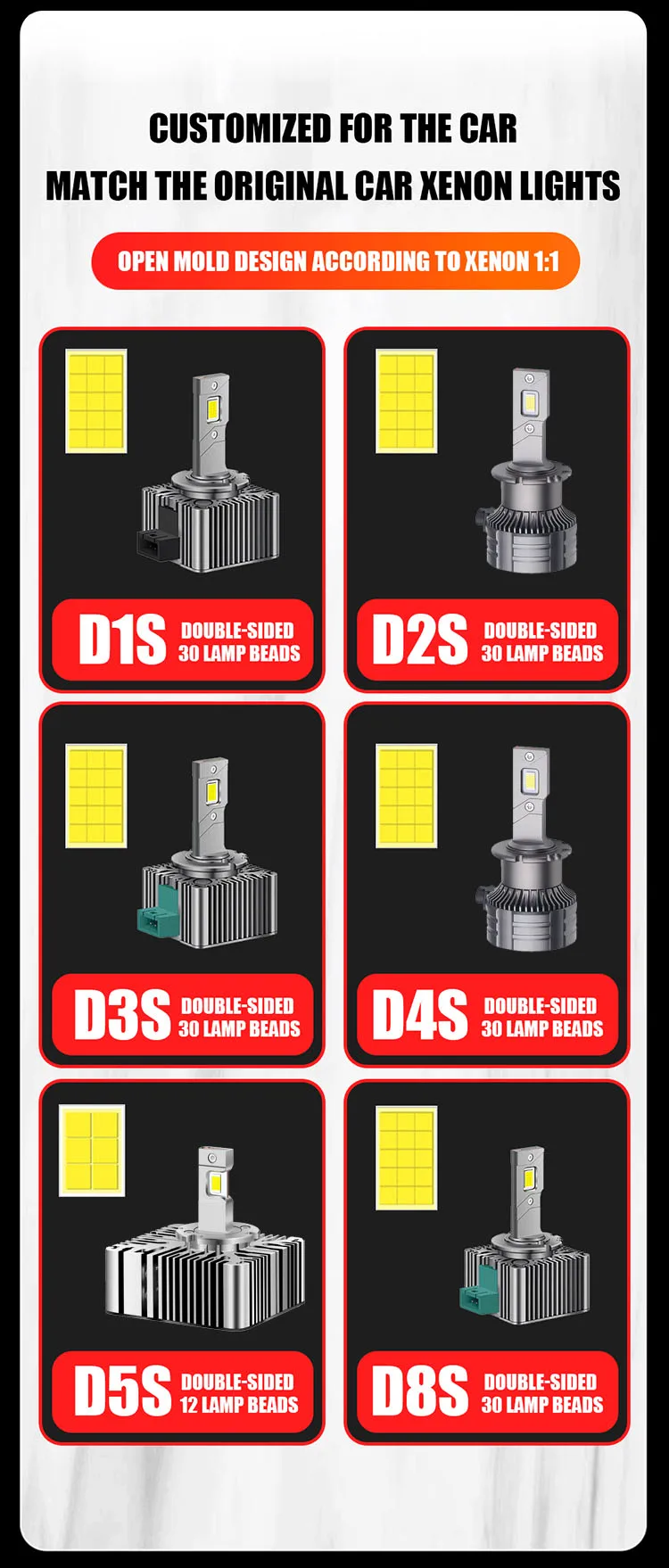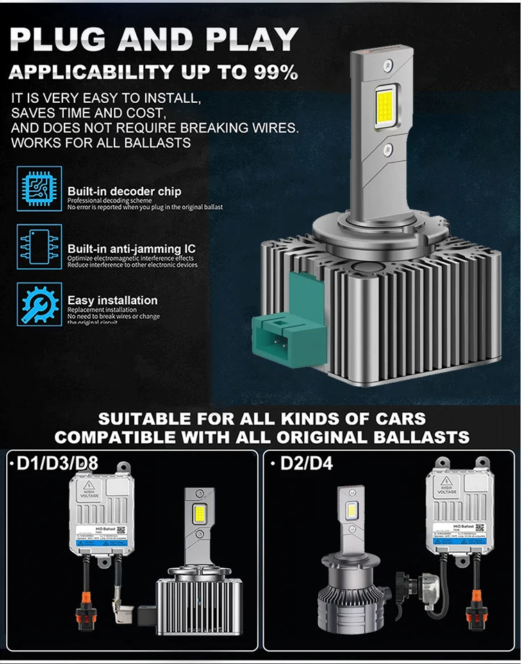 The D Series LED headlight bulbs are compatible with various socket types, including D1S, D2S, D3S, D4S, D5S, and D8S, making them suitable for a wide range of vehicles. This versatility allows for a straightforward upgrade from HID to LED lighting systems.
