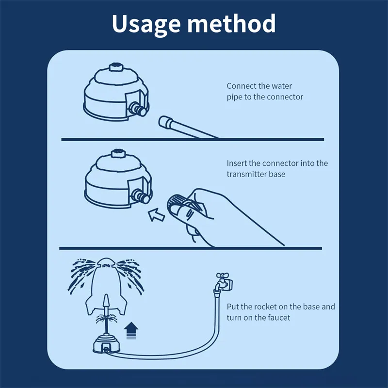 Easy to use, Connect the water pipe to the connector, insert the connector into the transmitter base, last, put the rocket on the base and