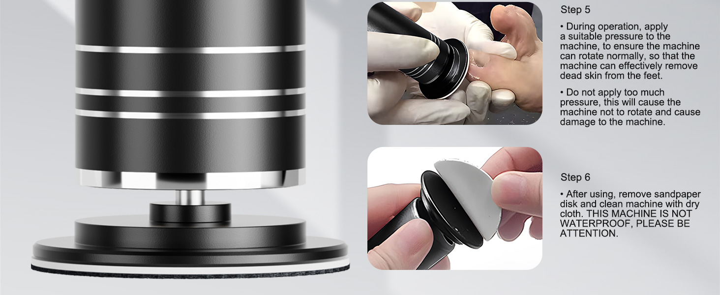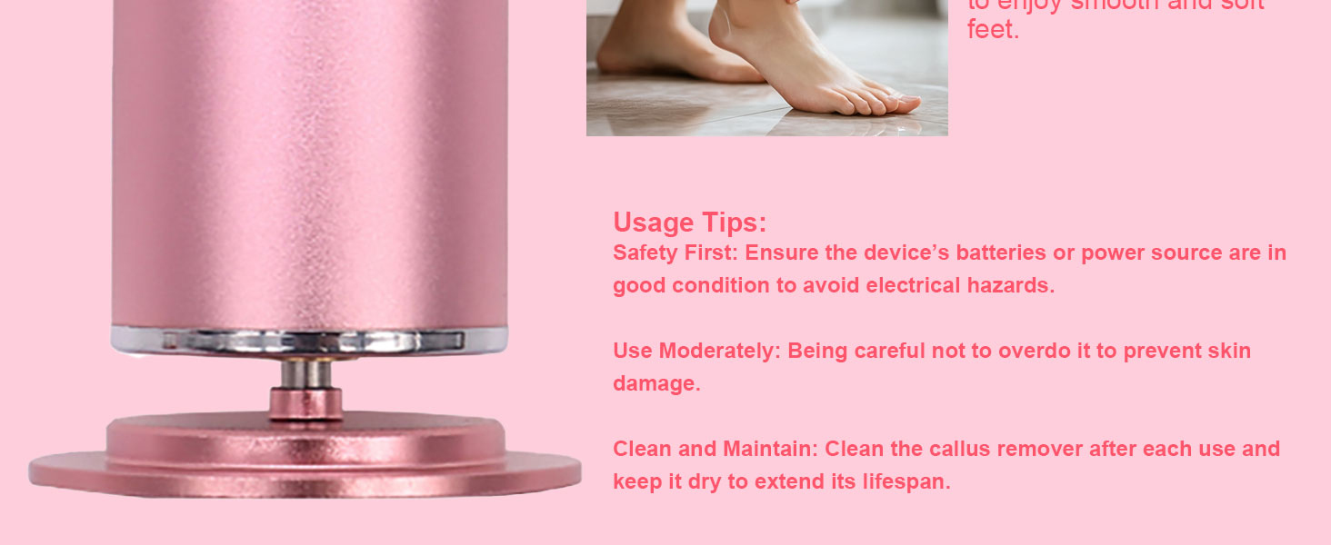 - Apply suitable pressure when using.to ensure the machine can rotate normally, so that the machine can effectively remove callus from the feet.