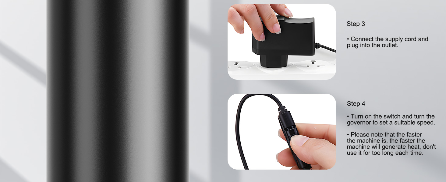 Connect the device and plug into the socket.Turn on switch and set suitable rotation speed.Please note that the faster the machine is,
