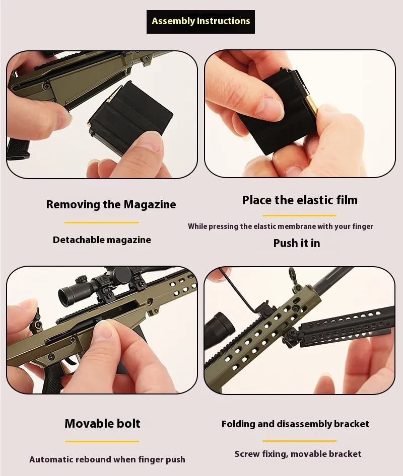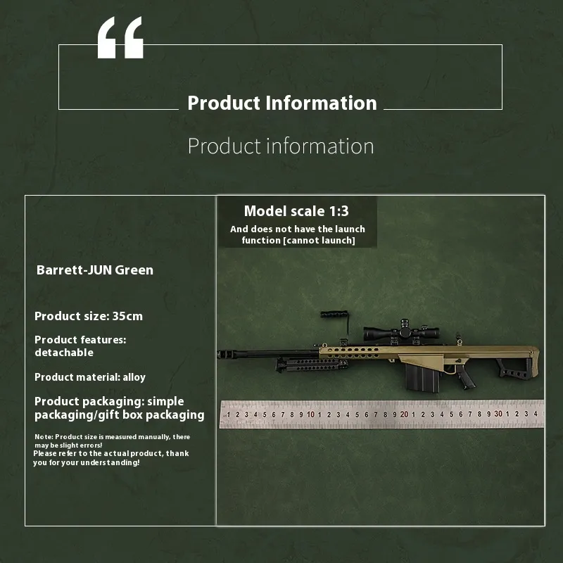 For military model collectors or fans of the Barrett M82A1 sniper rifle, this toy offers an exceptional level of detail and authenticity. The Detachable Barrett M82A1 Sniper Rifle Toy is an ideal piece to showcase in a collection, whether as part of a broader set of military models or as a standalone item. Its realistic design makes it a standout addition for anyone with an interest in firearms, military history, or model toy guns.