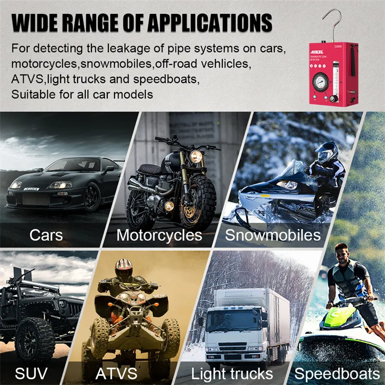 La herramienta de detección de fugas de vacío para detector de humo para automóviles es versátil y está diseñada para una amplia gama de aplicaciones de diagnóstico. Además de detectar fugas de vacío, también es muy eficaz para encontrar fugas en sistemas de combustible, sistemas turbo y EVAP, colectores de admisión y escapes. Esta flexibilidad la convierte en un activo valioso en cualquier taller, ideal para su uso en diversas marcas y modelos de vehículos. Con esta herramienta, los técnicos y propietarios de automóviles pueden diagnosticar problemas rápidamente, previniendo daños a largo plazo en el motor y sus componentes.