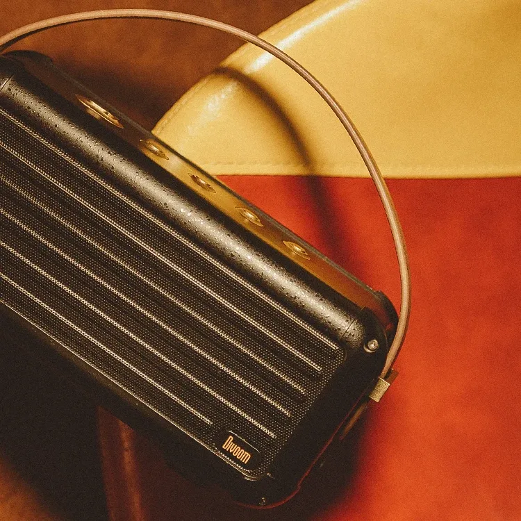The Dianyin Mocha Wireless Bluetooth Speaker features a retro-style exterior with wood-inspired textures and rotary dials, making it a statement piece that blends seamlessly into any environment.