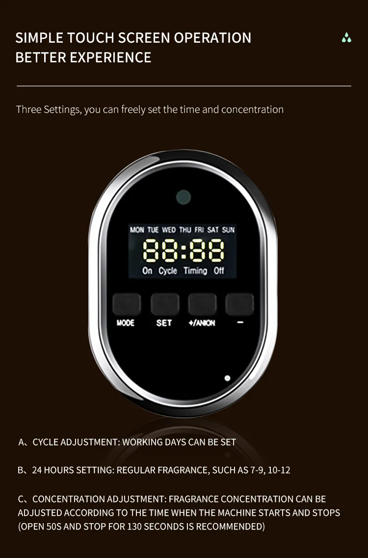- Difusión Continua: Proporciona una difusión continua del aroma durante horas, ideal para negocios y espacios comerciales.