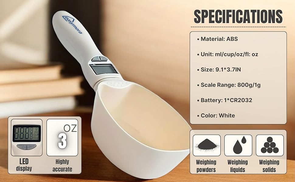 Considerate Design: The electronic scale spoon with clear LCD display and button cell (included), easy to see the readings and convenient to use.This Scoop effectively measures liquid and solid ingredients in grams, mls, cups and oz.