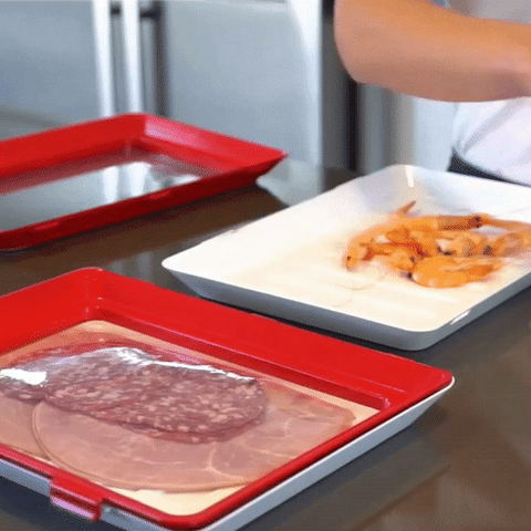 Esto facilita para sellar la comida en segundos y liberar el aire de la bandeja después de llenarla. De esta manera, tus alimentos se mantienen frescos por más tiempo. Al mismo tiempo, no hay envases abiertos ni olores desagradables en tu refrigerador. 💪 Se utiliza para muchos tipos de alimentos. Ya sea que quieras conservar frutas, carnes, verduras, embutidos, queso, pizza, pescado o mantener frescos tus pasteles, estas bandejas creativas son la mejor solución. Estas bandejas de almacenamiento al vacío mantendrán tus alimentos en buen estado. conservado.