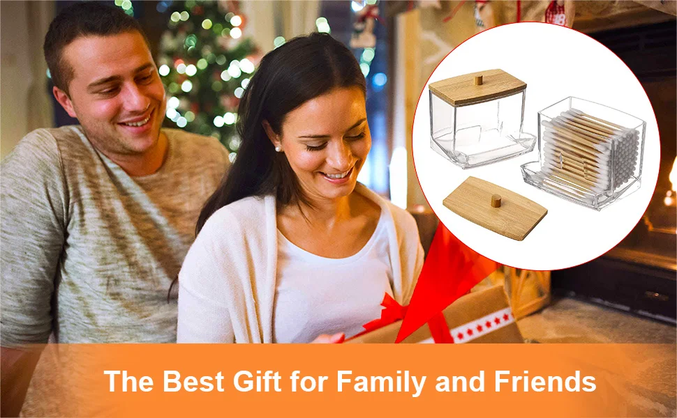 Dispensador de plástico transparente con tapa de bambú para hisopos de algodón