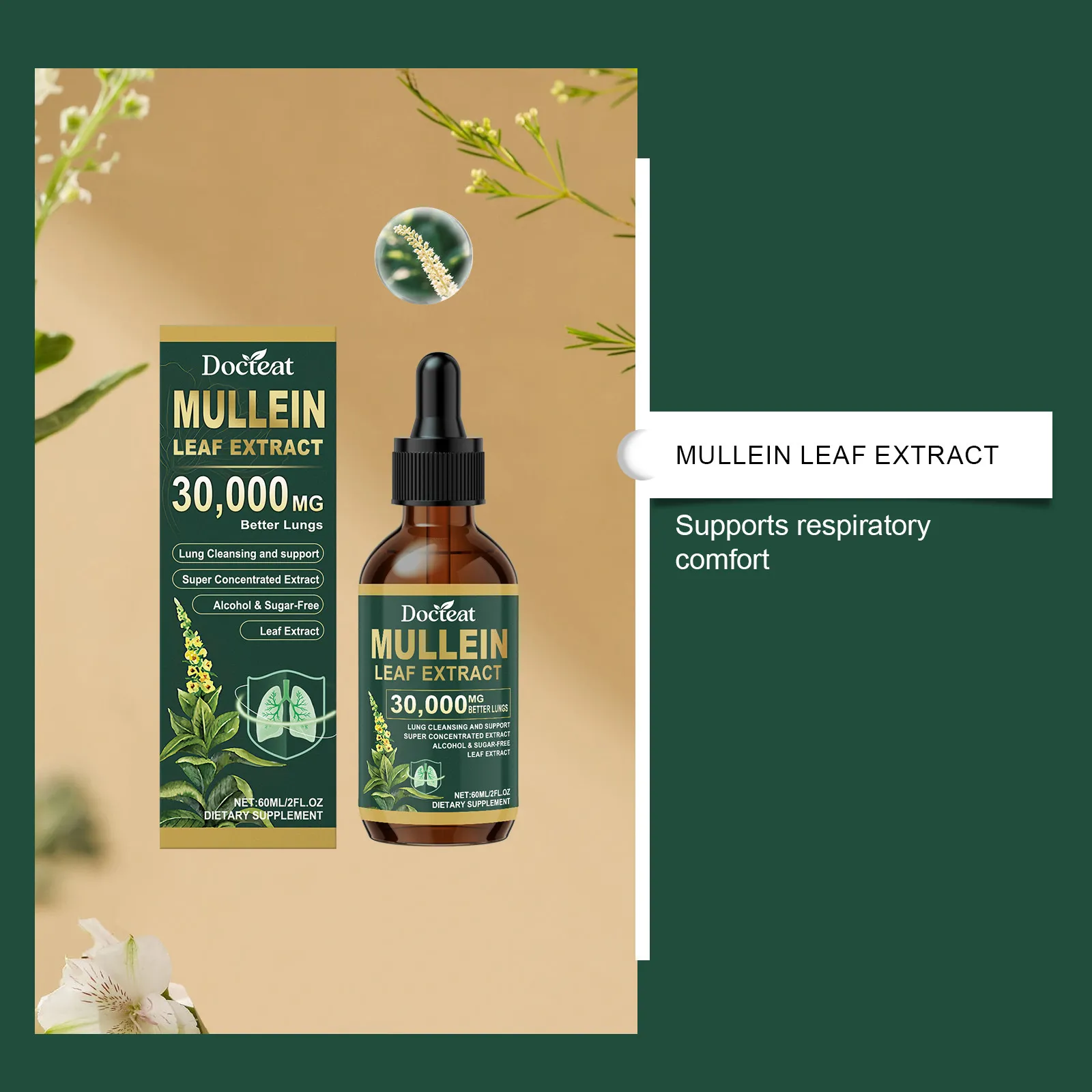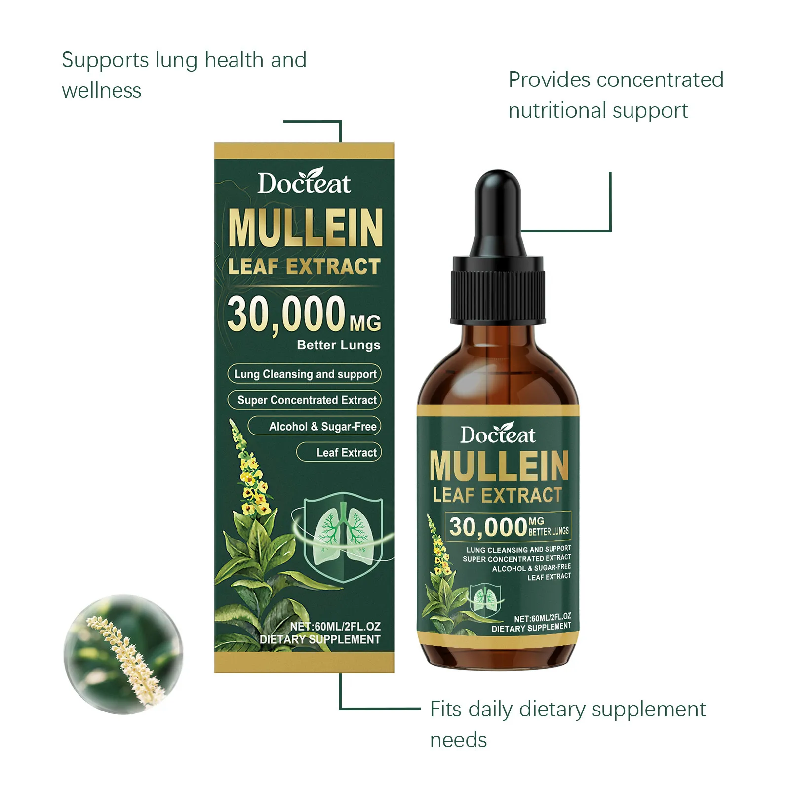 Docteat Mullein Leaf Extract 30,000MG is formulated as a concentrated herbal liquid supplement designed to complement daily wellness routines. Presented in a dropper bottle, this supplement allows simple dosing and easy integration into modern health habits.