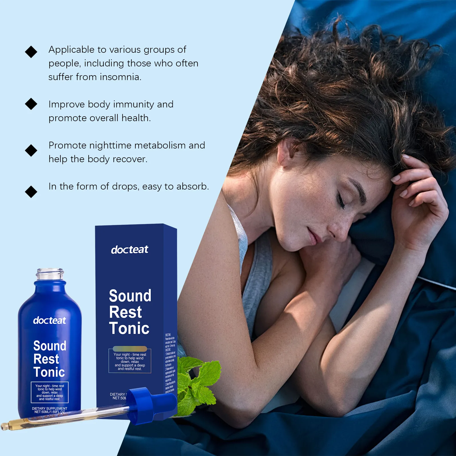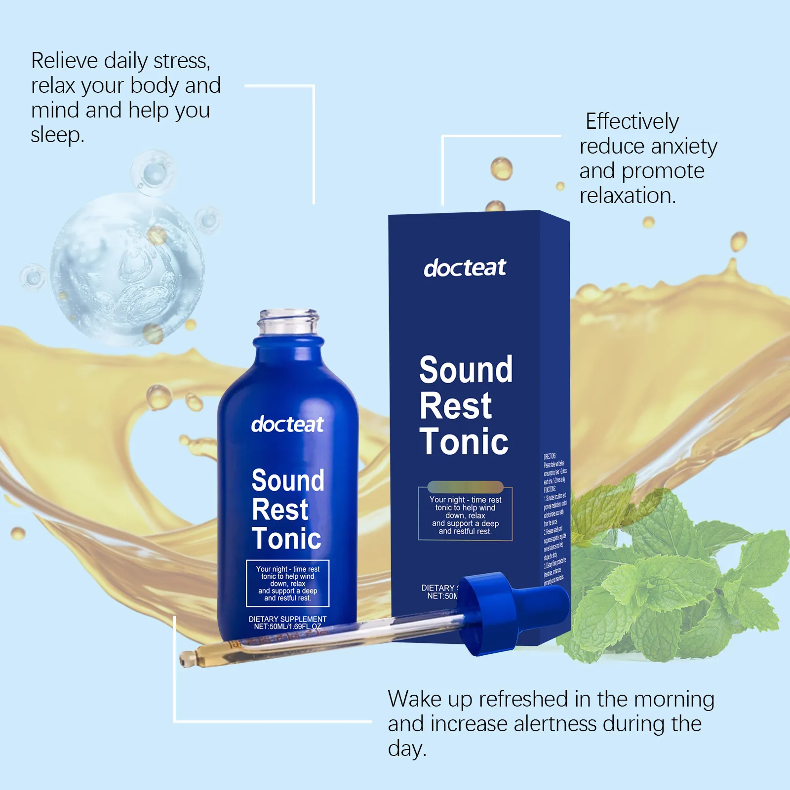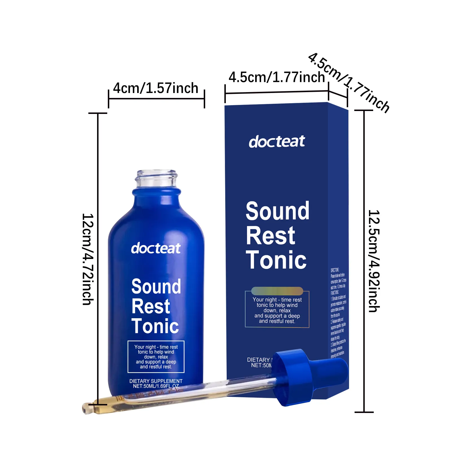 The Docteat Sound Rest Tonic is a 50ml liquid dietary supplement presented in a blue glass dropper bottle designed for precise dosing and ingredient protection. Positioned as a night-time rest tonic, this formula is crafted to complement healthy sleep routines and support relaxation before bed.
