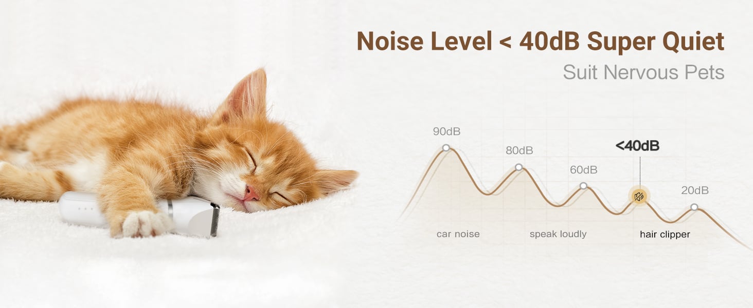 - Low Noise Dog clipper<40dB - This dog clipper kit, is truly low noise, noise level <40dB. Suitable for small pets, as well as very sensitive pets. For very sensitive pets, it will be afraid of noisy dog clipper, and this dog grooming kit that will not be awakened your sleeping pet. Focus on the better shaving experience that dog clipper kit brings to pets.